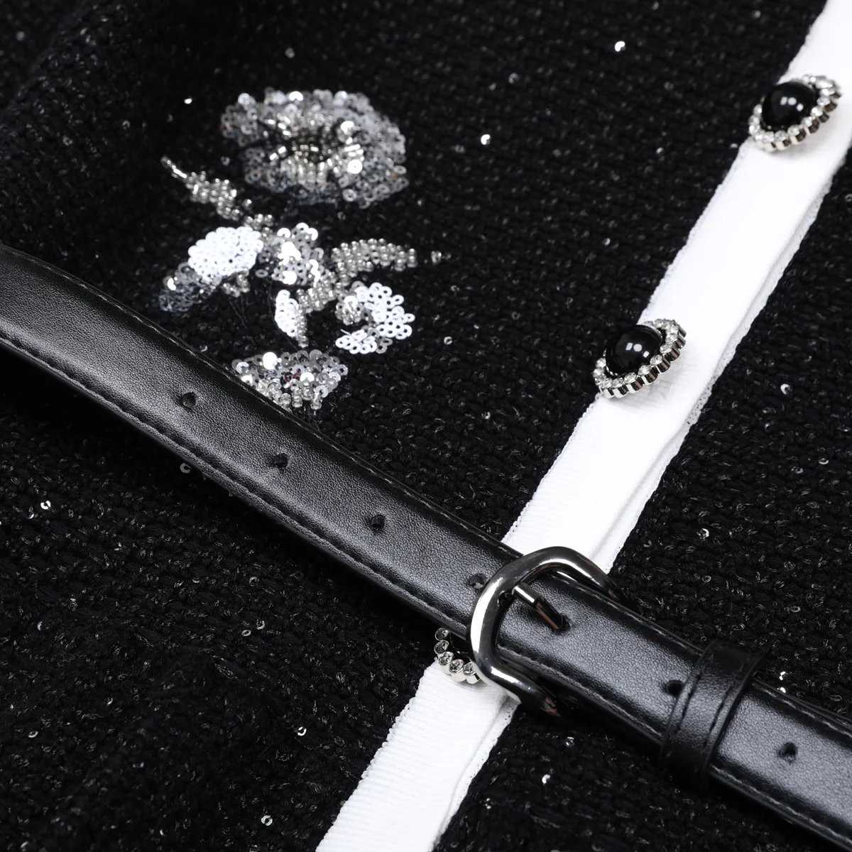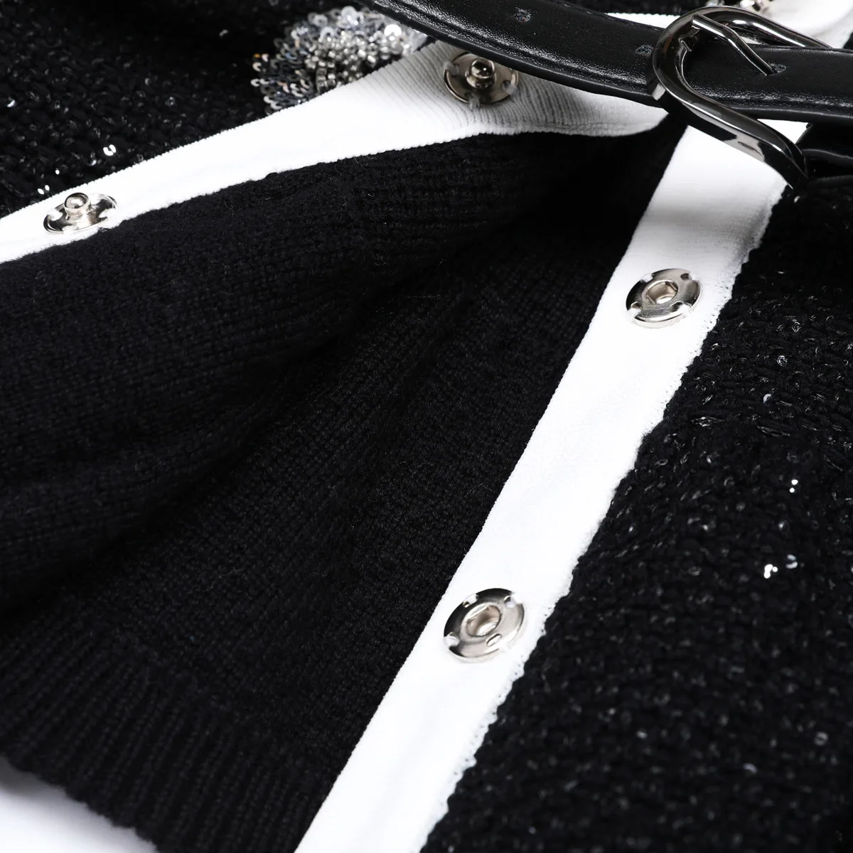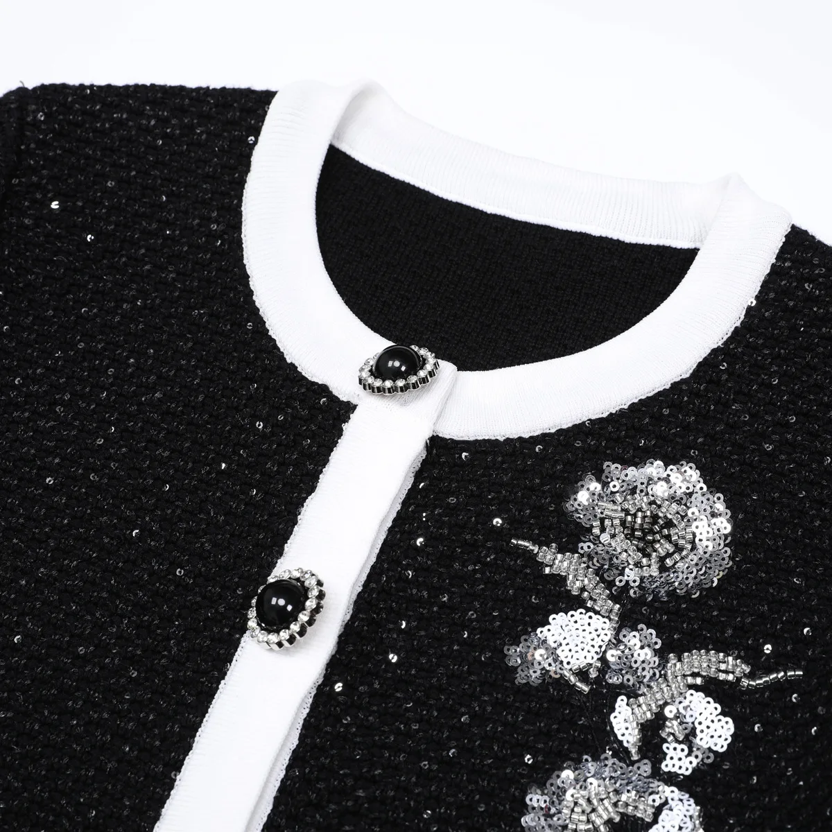 Sequin Flower Women Quality Solid Color Fashion Color Set O Collar Long Sleeve Cardigan Midi Skirt Women Knitted 2 Piece Set