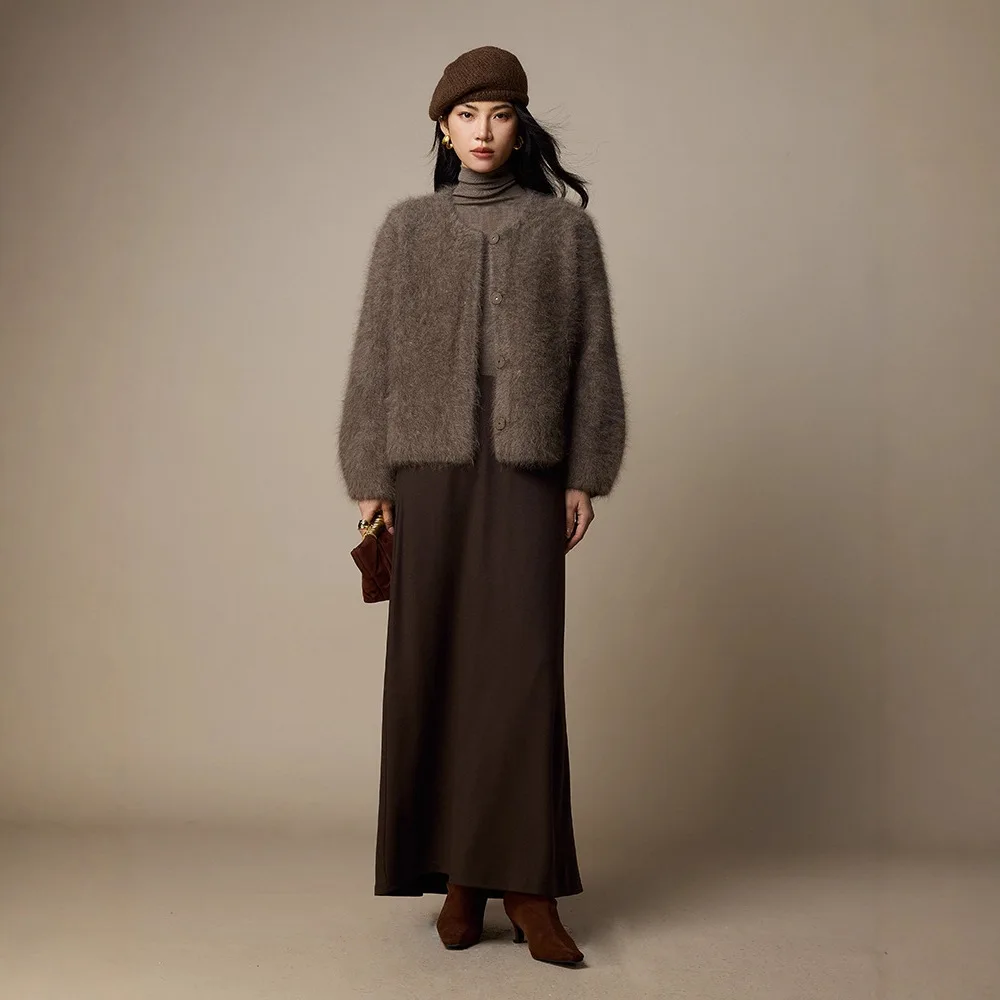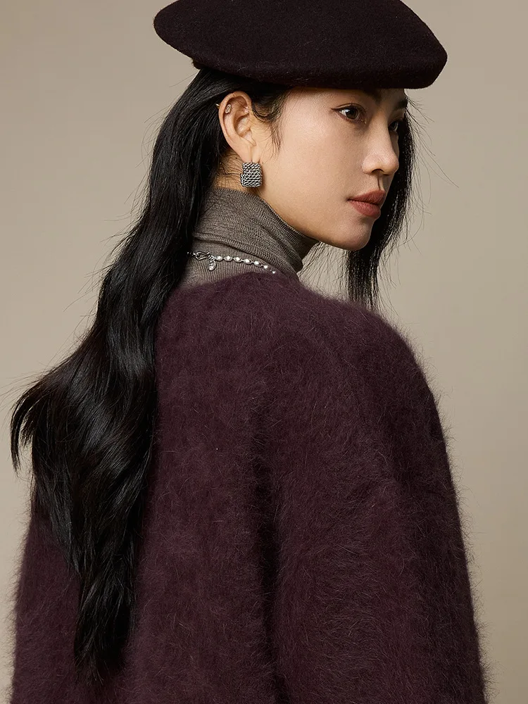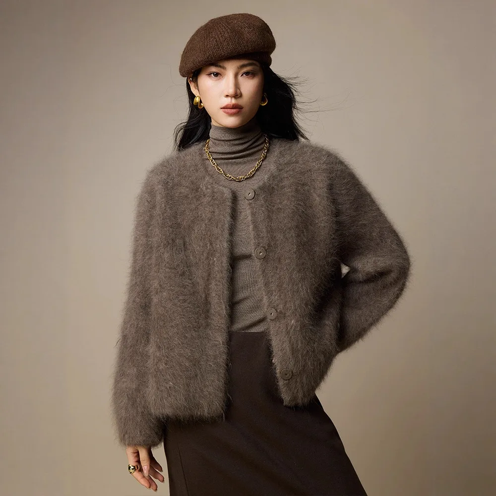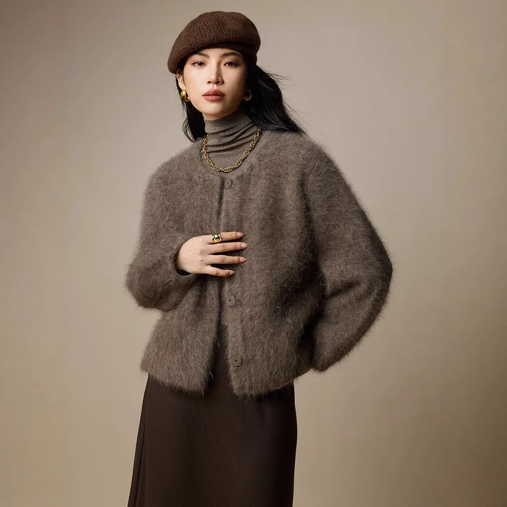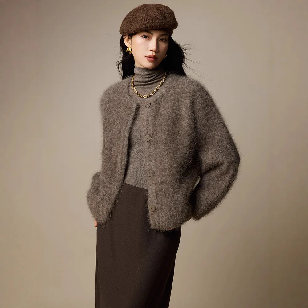Light Luxury Lady Mammoth Velvet Crewneck Sweater Coat Autumn and Winter New Women's Wool Knitted Cardigan