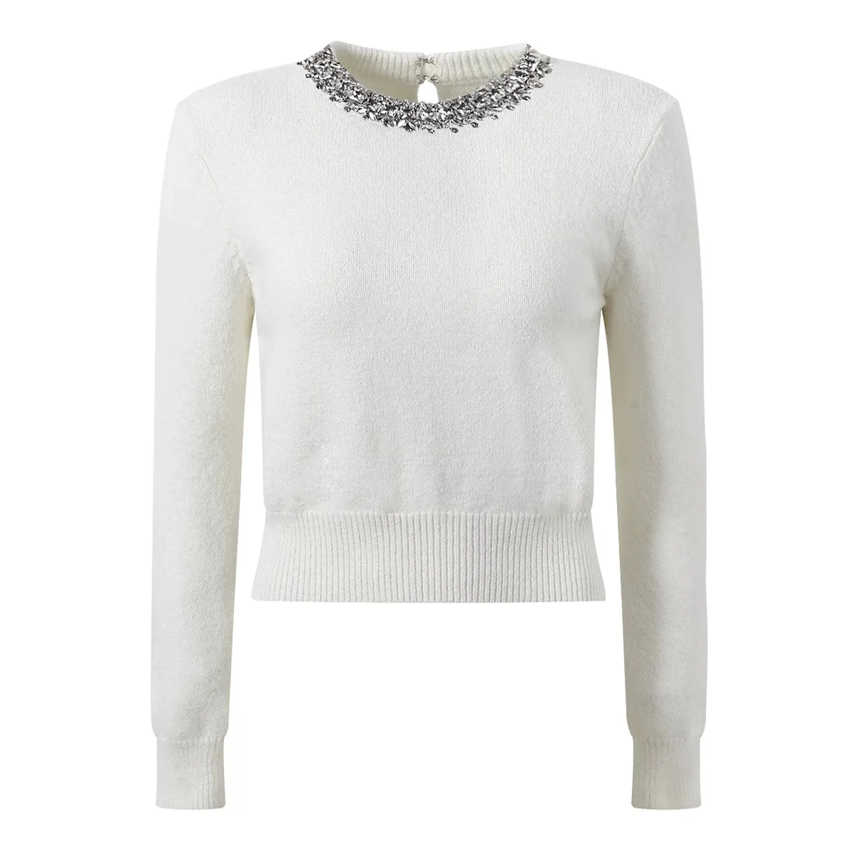 Early Spring New Round Neck Light Grey Sweet Multifunctional Diamond Embellished Long Sleeve Knitted Sweater Top