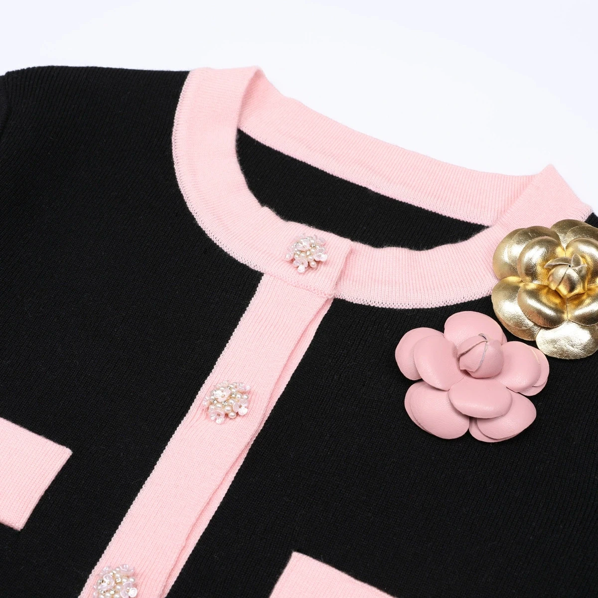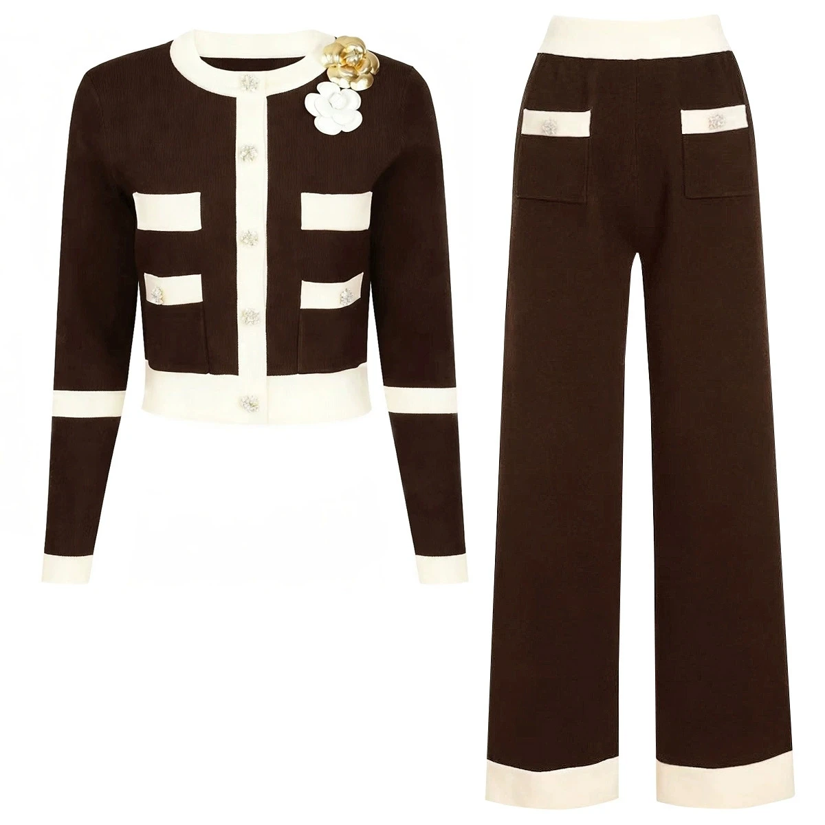 Autumn 2026 Office Casual Suit Neck Long Sleeve 3D Flower Decorative Cardigan Wide Leg Solid Pants Women's Knitted 2-Piece Set