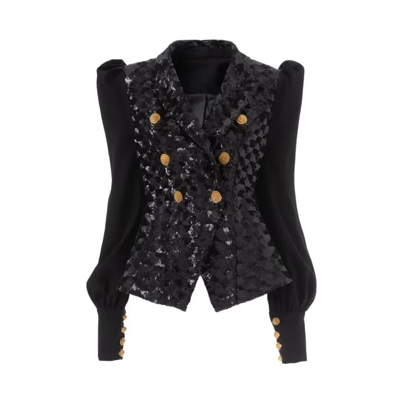 ZYHT 35239 Women's Elegant Black Velvet Blazer with White Ruffled Trim Peplum Hem & Long Puff Sleeves Chic Formal Jacket