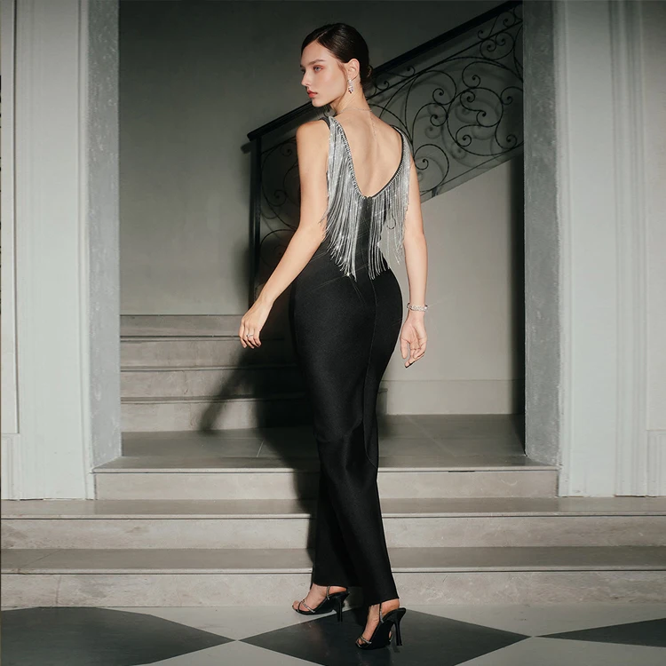Elegant Backless Fringe Tassel Midi Evening for Women Bandage Fabric Tassel Embellished Formal Party Dress