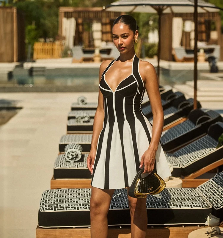 Luxury Black and White Bandage Dress V Neck Halter Elegant A-Line Party Dress for Women