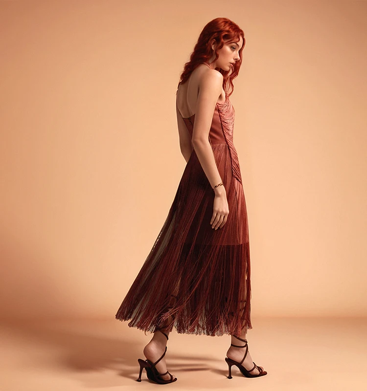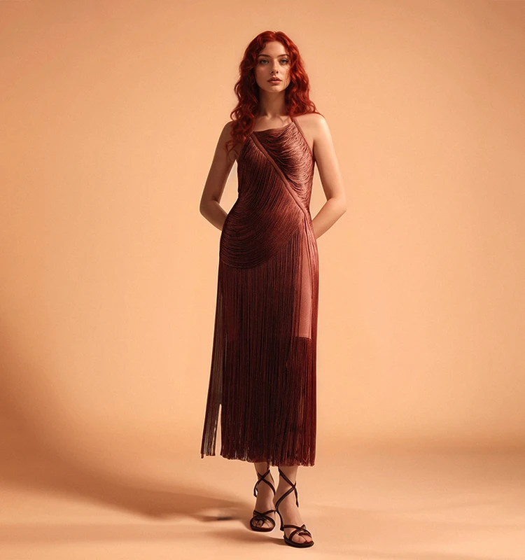 Stunning Draped Fringe Halter Dress Elegant Sleeveless Design for Cocktail Parties and Glamorous Nights