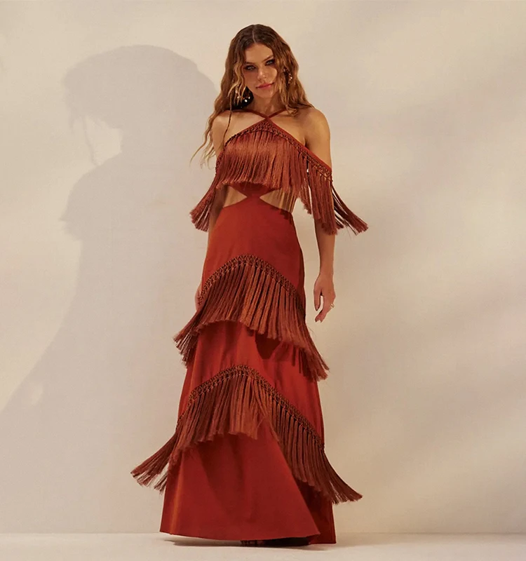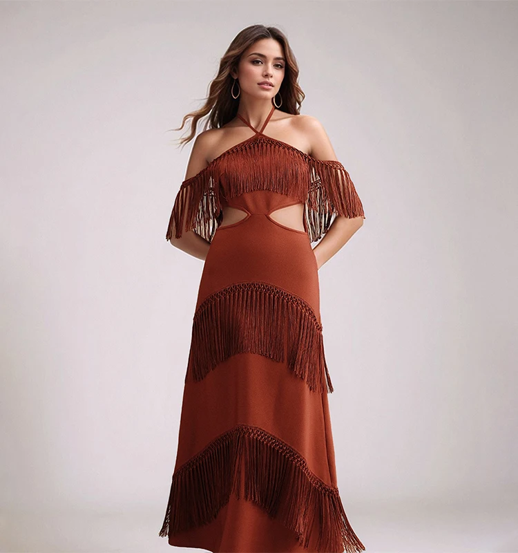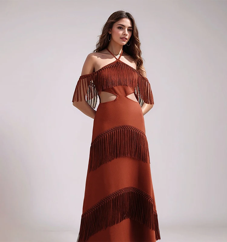 Wholesale Bohemian Off Shoulder Fringe Maxi Dress Women Bandage Halter Long Dress Summer Elegant Party Dresses