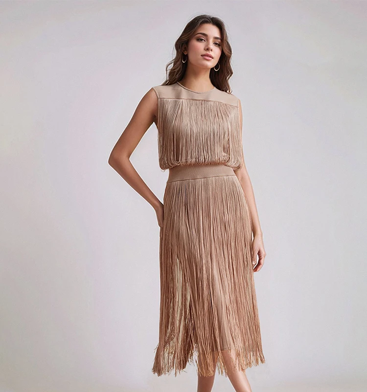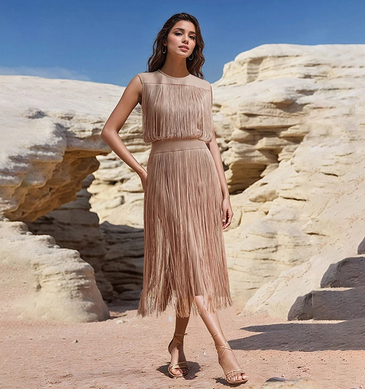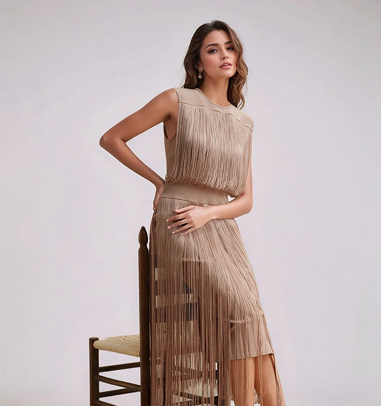 Wholesale Sleeveless Bandage Fringe Midi Dress for Women Elegant Tassel Party Outfit Sexy Bodycon Bandage OEM/ODM Clothing