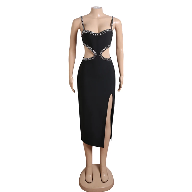 Fashion Wear Ladies Sexy Cut Out Design Black Bandage Evening Gala Dresses With Beads