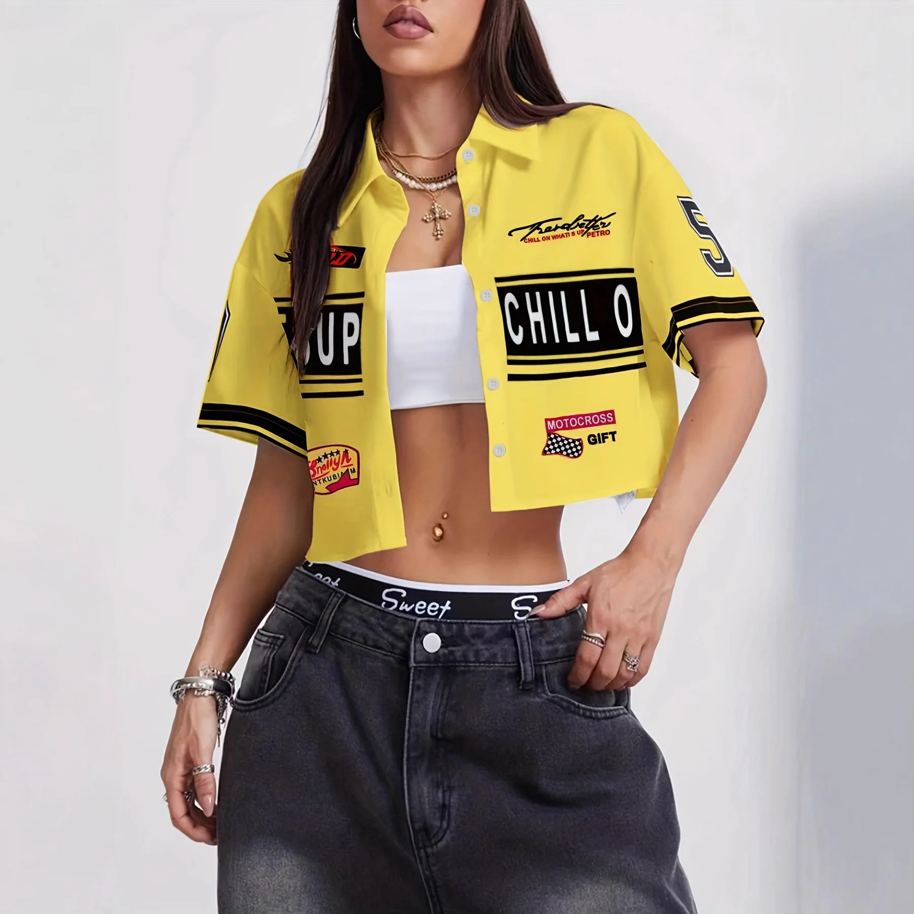 Women's Clothing Supplier New Summer Women's Clothing Letter Print Stand-up Collar Ladies Knit Top Fashion Racing Short T-shirt