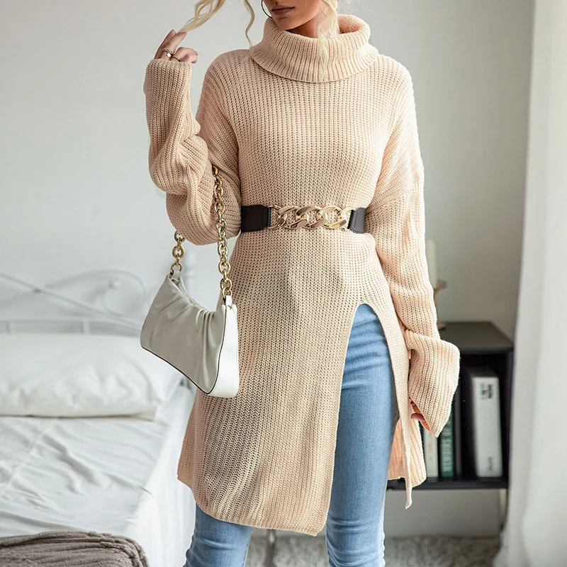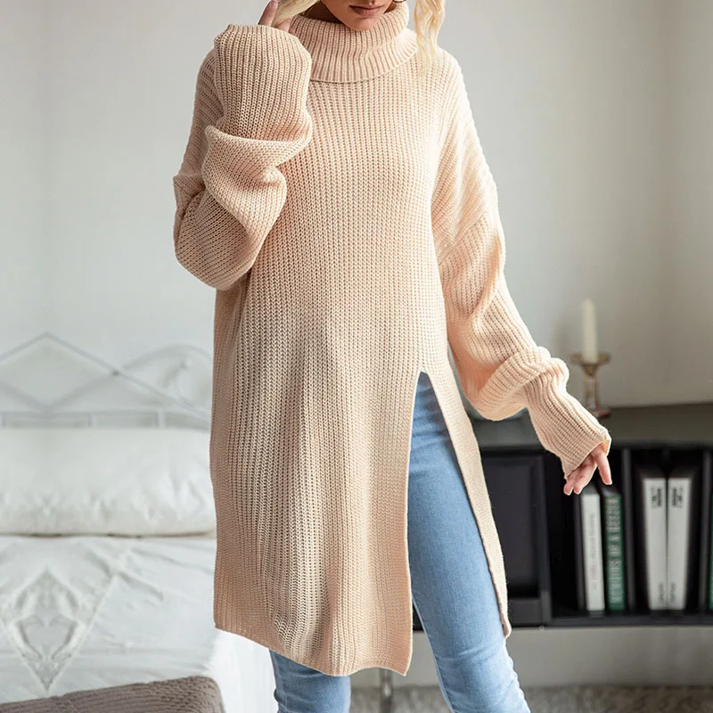 New Women's Autumn and Winter Leisure Lazy Style Mid-Length Split High-Neck Solid Color Women's Sweater Clothing Manufacturer