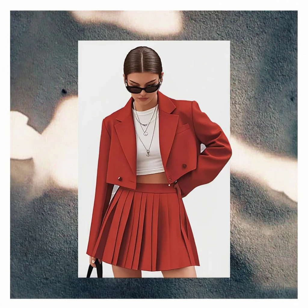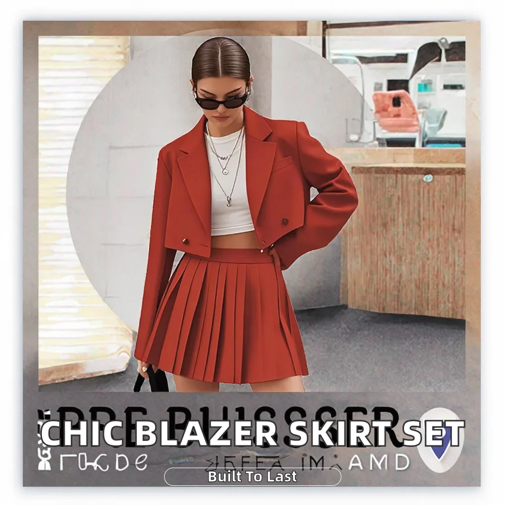 Women Stylish Long Blazer Jacket Mini Skirt 2 Piece Formal Business Suit Set Cartoon Print Satin