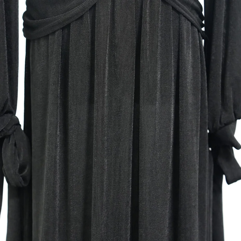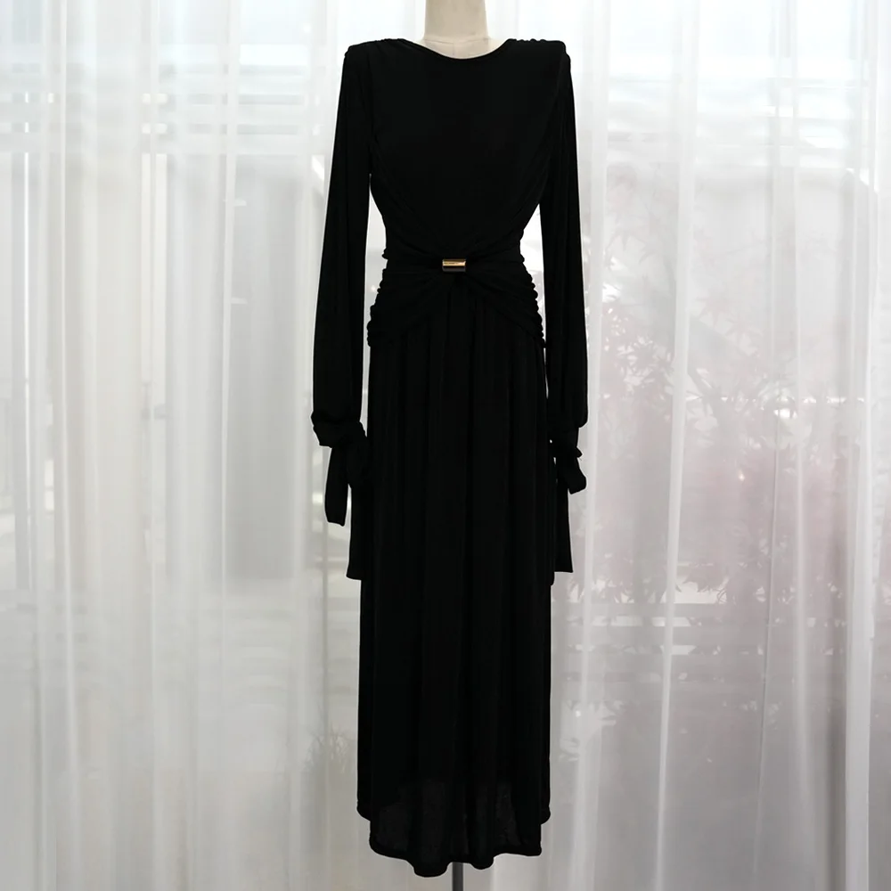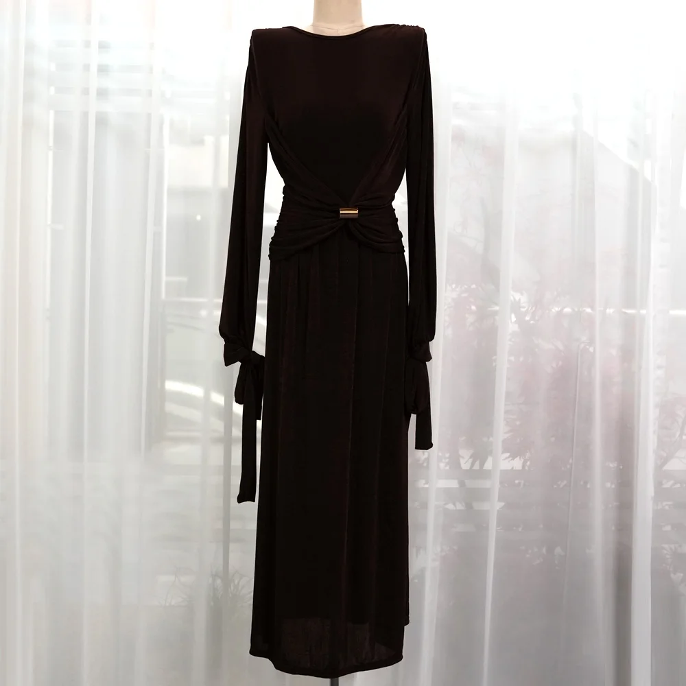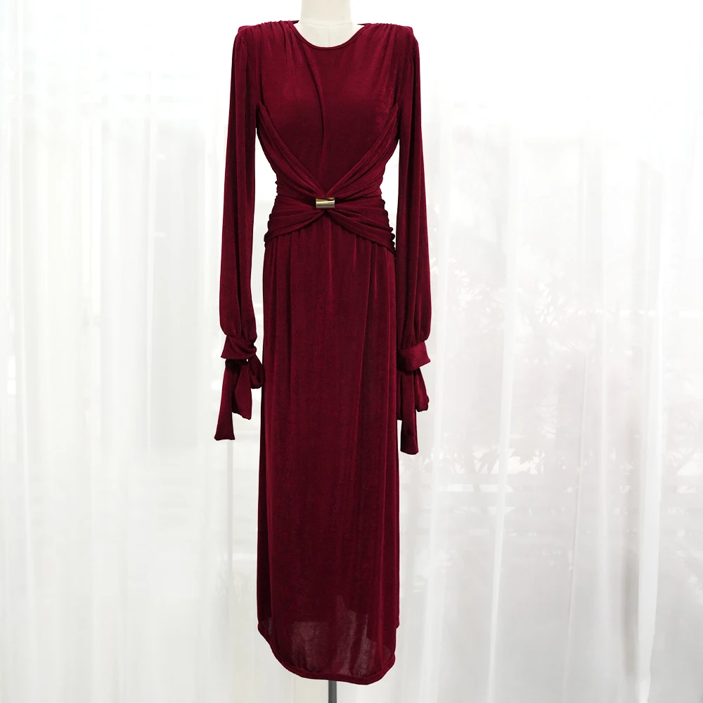 ZYHT 21541 Wholesale Crew Neck High Waist Casual Dresses Elegant Lace Velvet Mermaid Hem Ruched Long Sleeve Dresses for Women