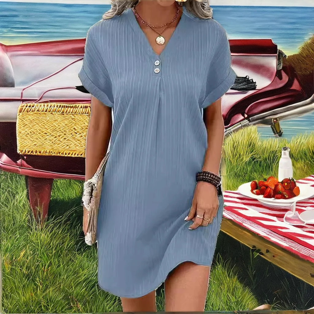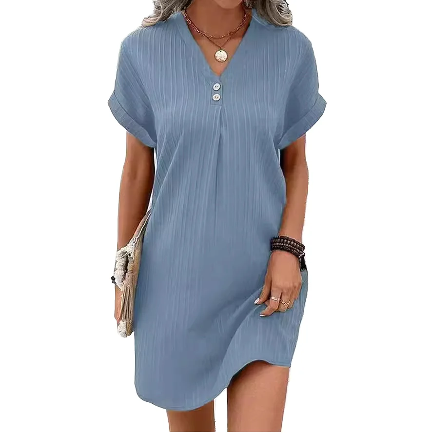 European American Women's Summer V-Neck Pullover Casual Button Design Solid Color Knee-Length Breathable Nonwoven Front WORSTED