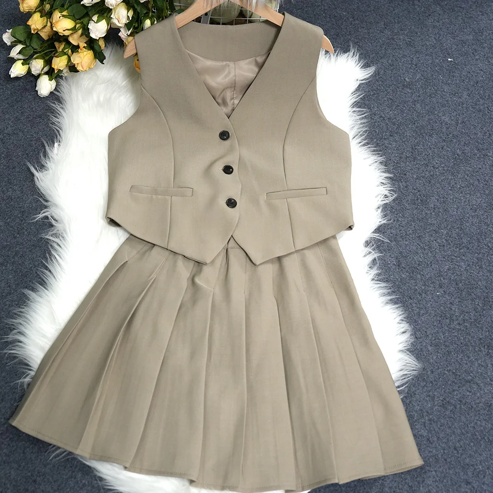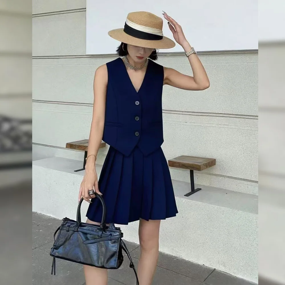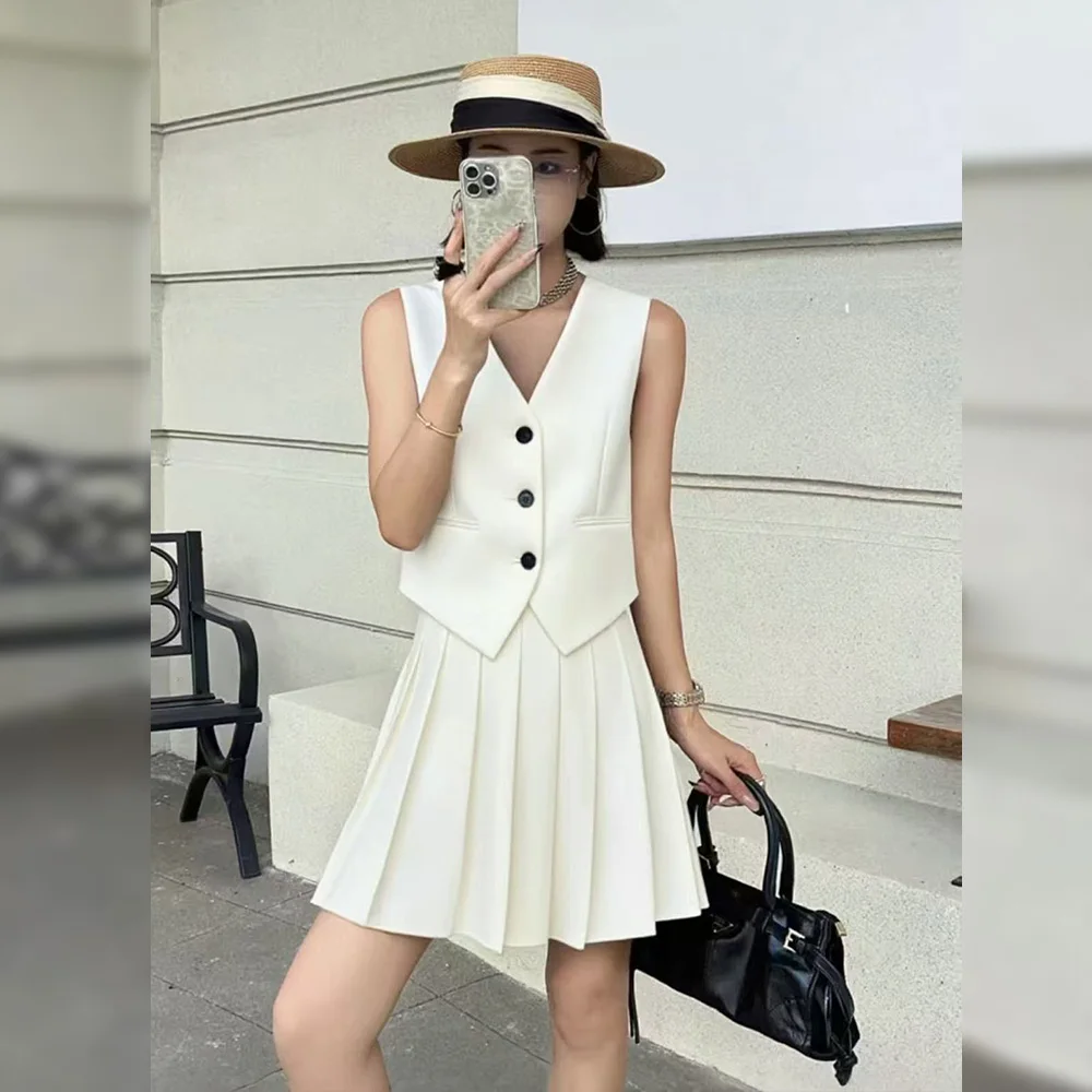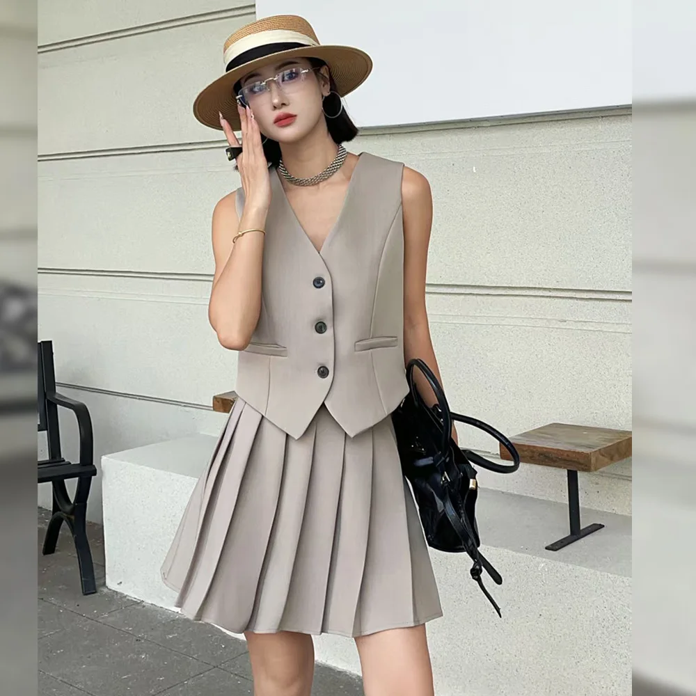 Office Lady V-neck Solid-color tank Top Sleeveless Fashionable Set - Elegant Women's Short Two-piece Set