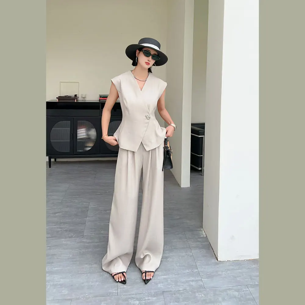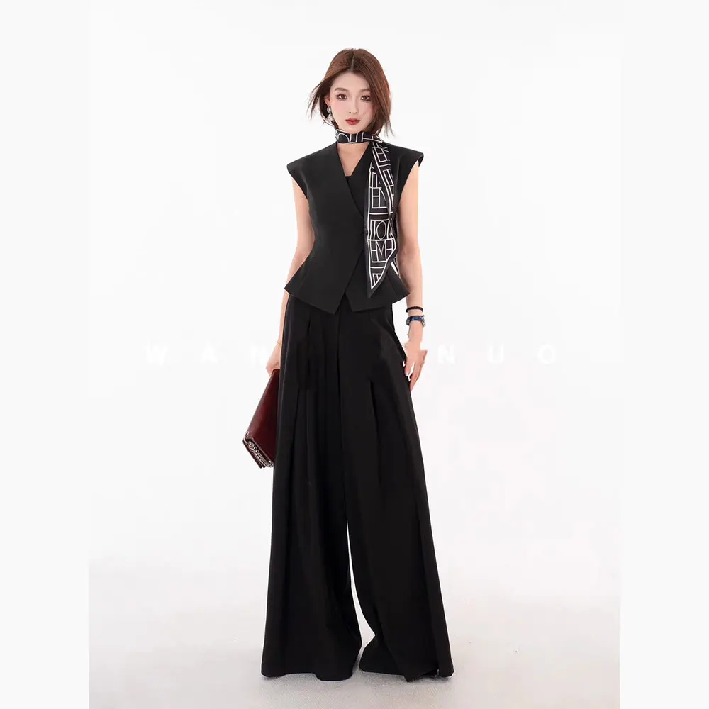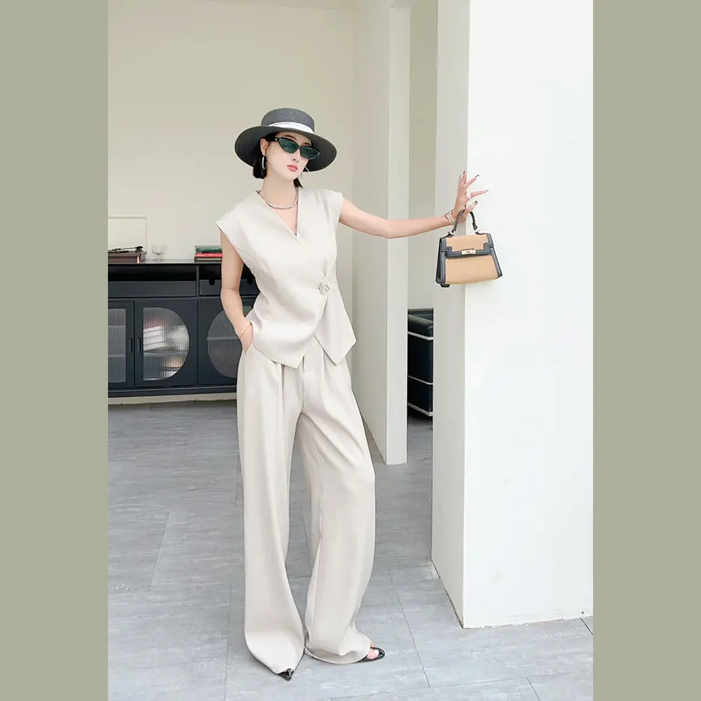 Women's Two-Piece Suit Set - Suit Fabric, Sleeveless Vest & Wide-Leg Pants, Versatile Style, with Lining