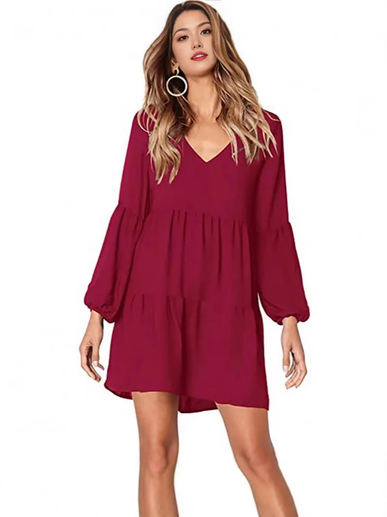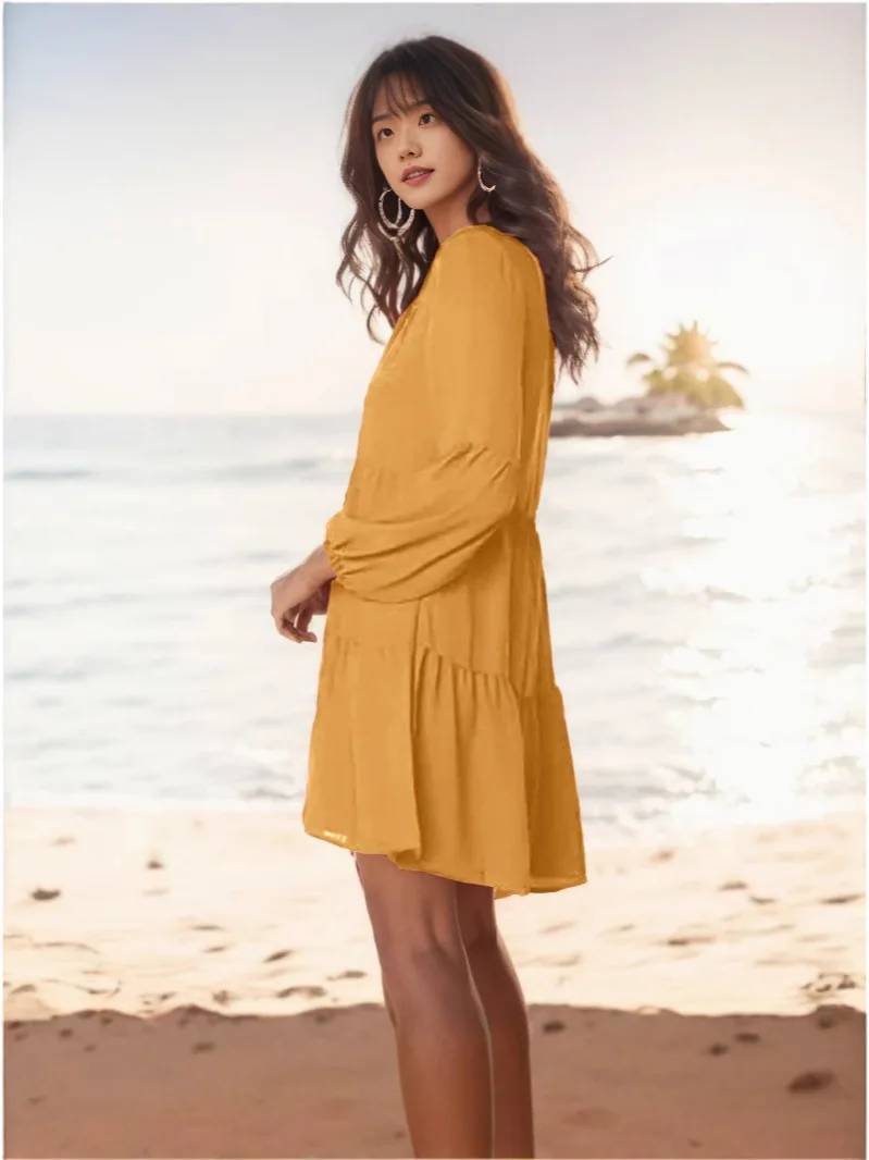Women's Summer V Neck Dress Loose Flowy Mini Swing Shift Tunic Chiffon Lace Decoration Solid Pattern Woven Casual Style Order