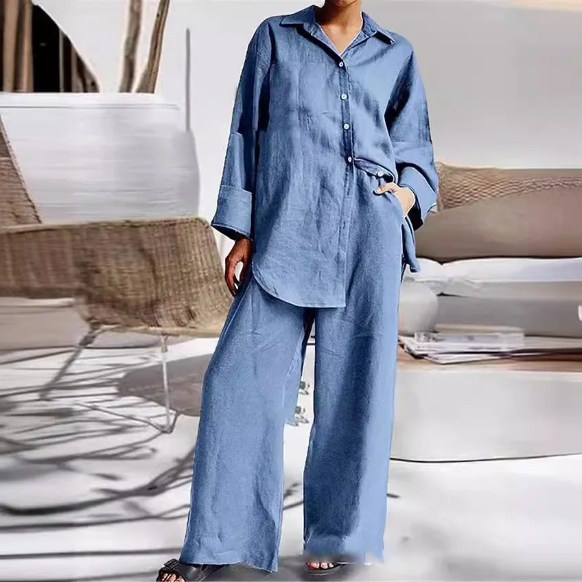 Hot Selling Spring Autumn Women's Casual Daily Wear Solid Color Cotton and Linen Two-Piece Set-Loose Pants Shirt Set
