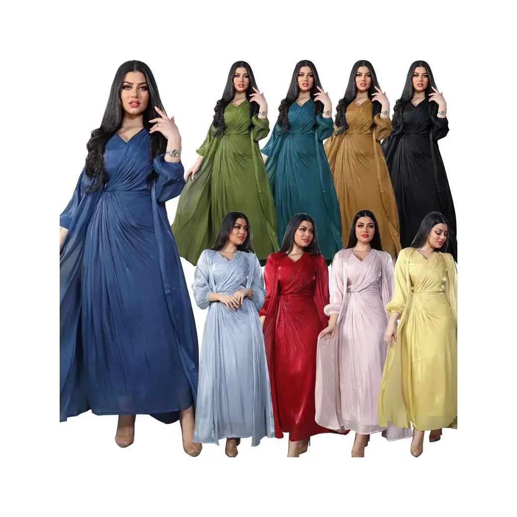 Wholesale Modest Satin 2 Pieces Set Abaya Women Muslim Dress Dubai Arab Women Kaftan Girl Party Dresses