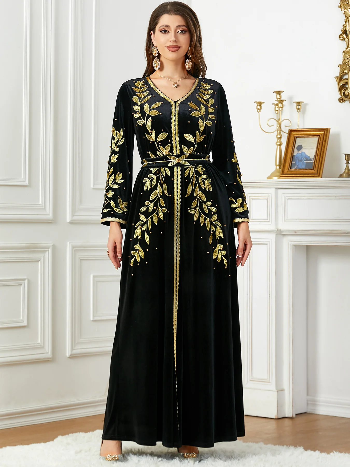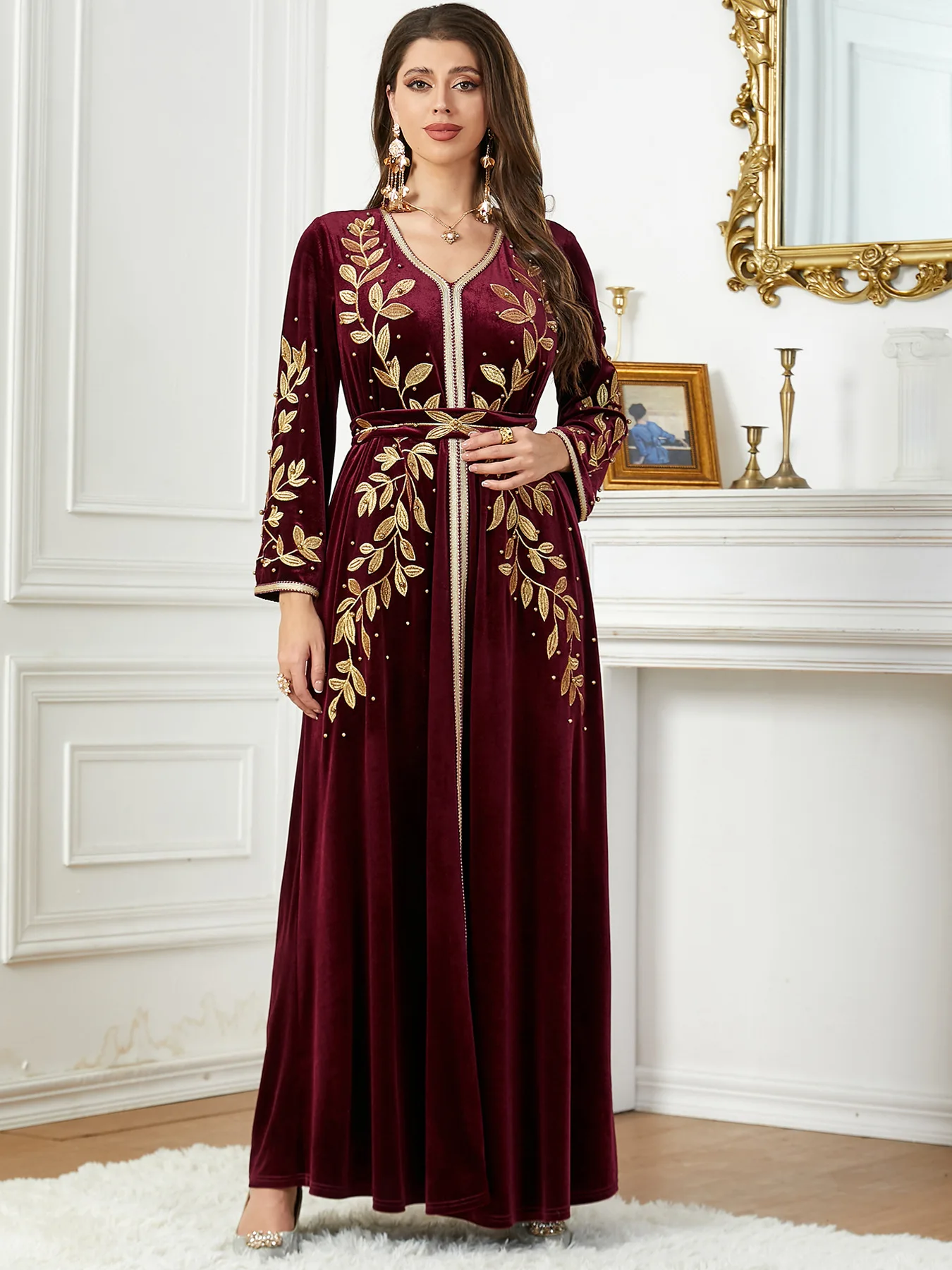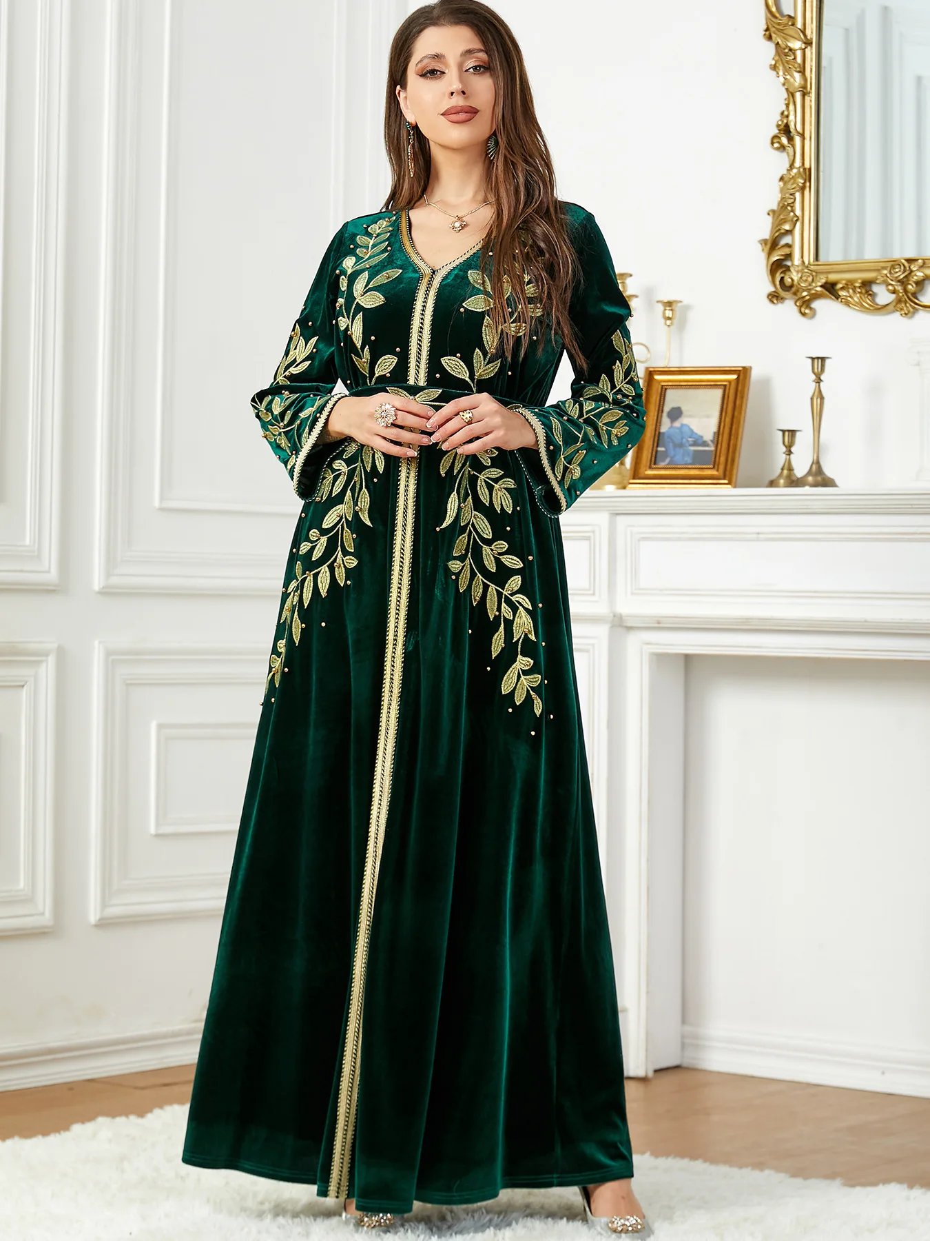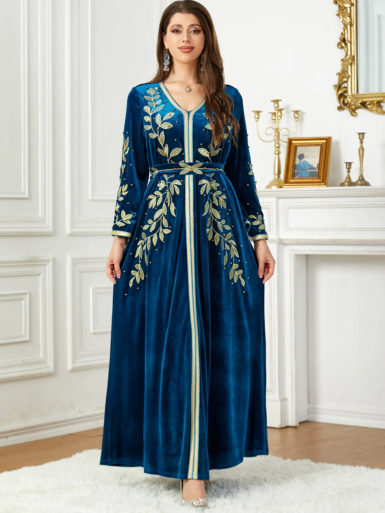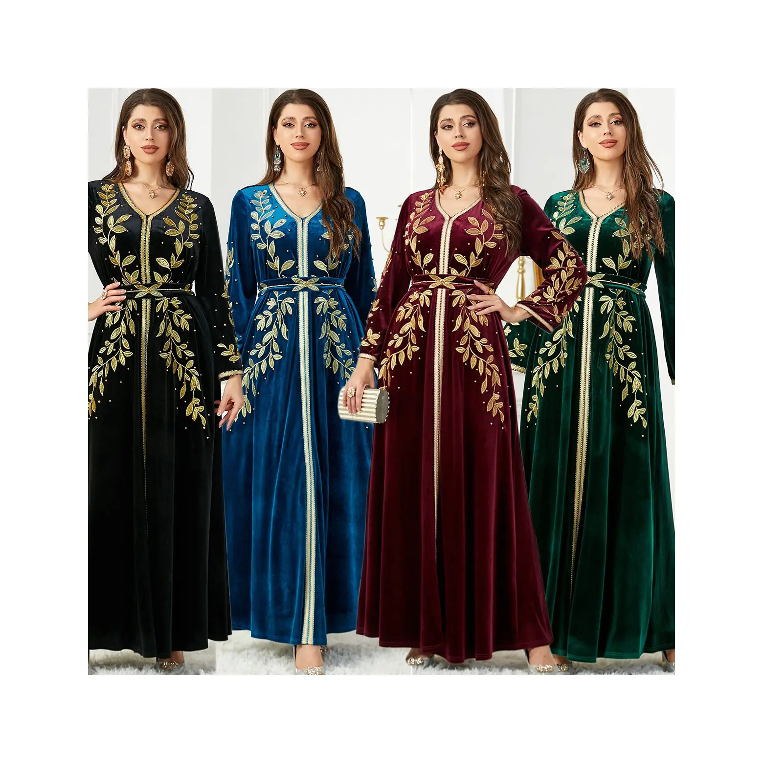 Wholesale High Quality Long Sleeve Abaya Women Muslim Dress Embroidery Beaded Velvet Women Kaftan Girl Party Dresses