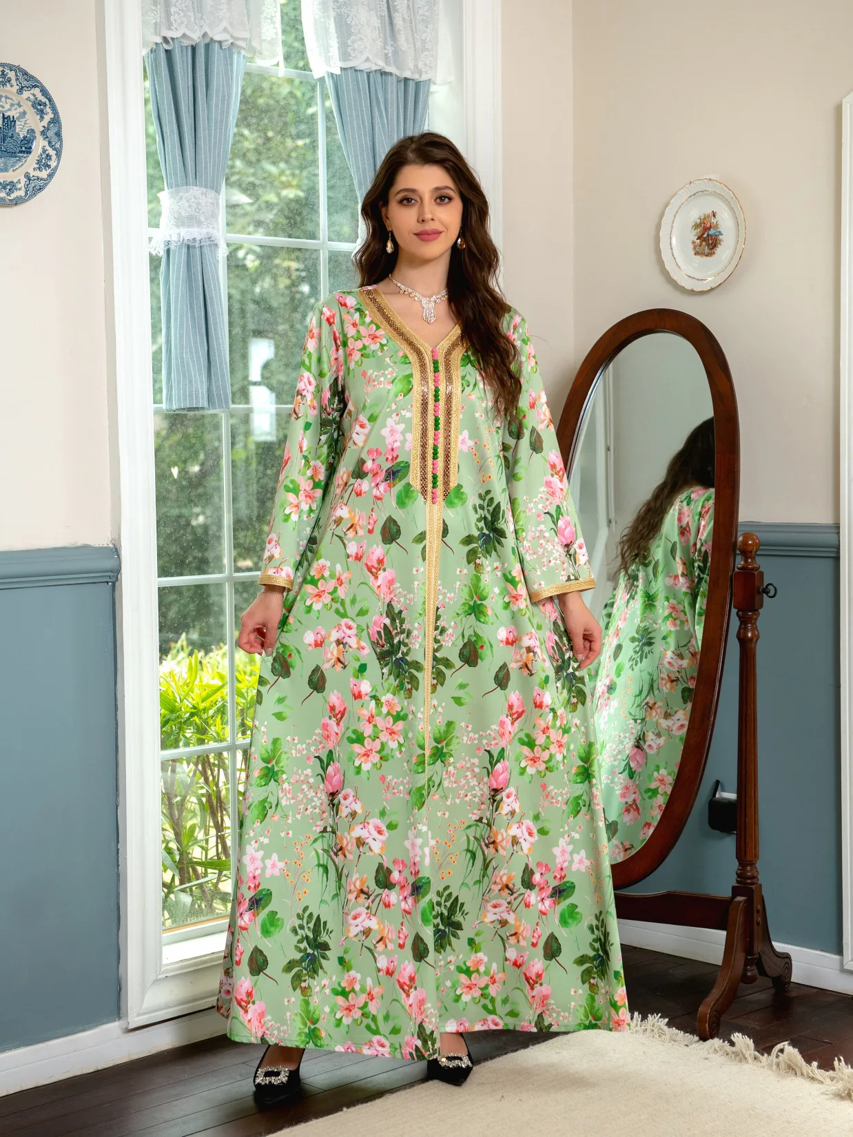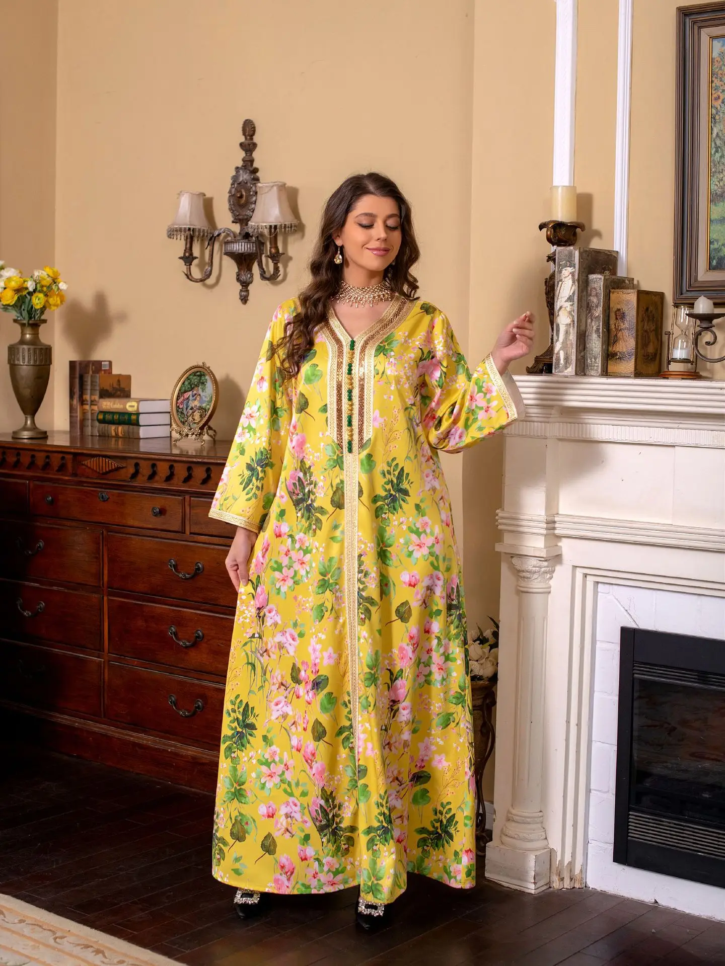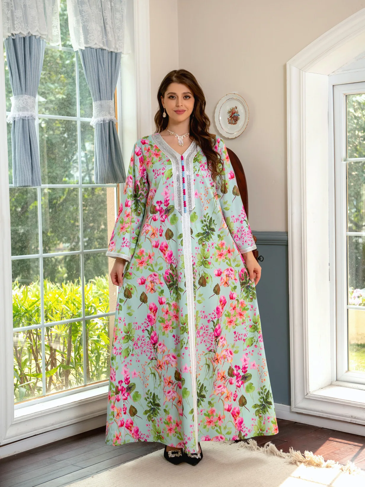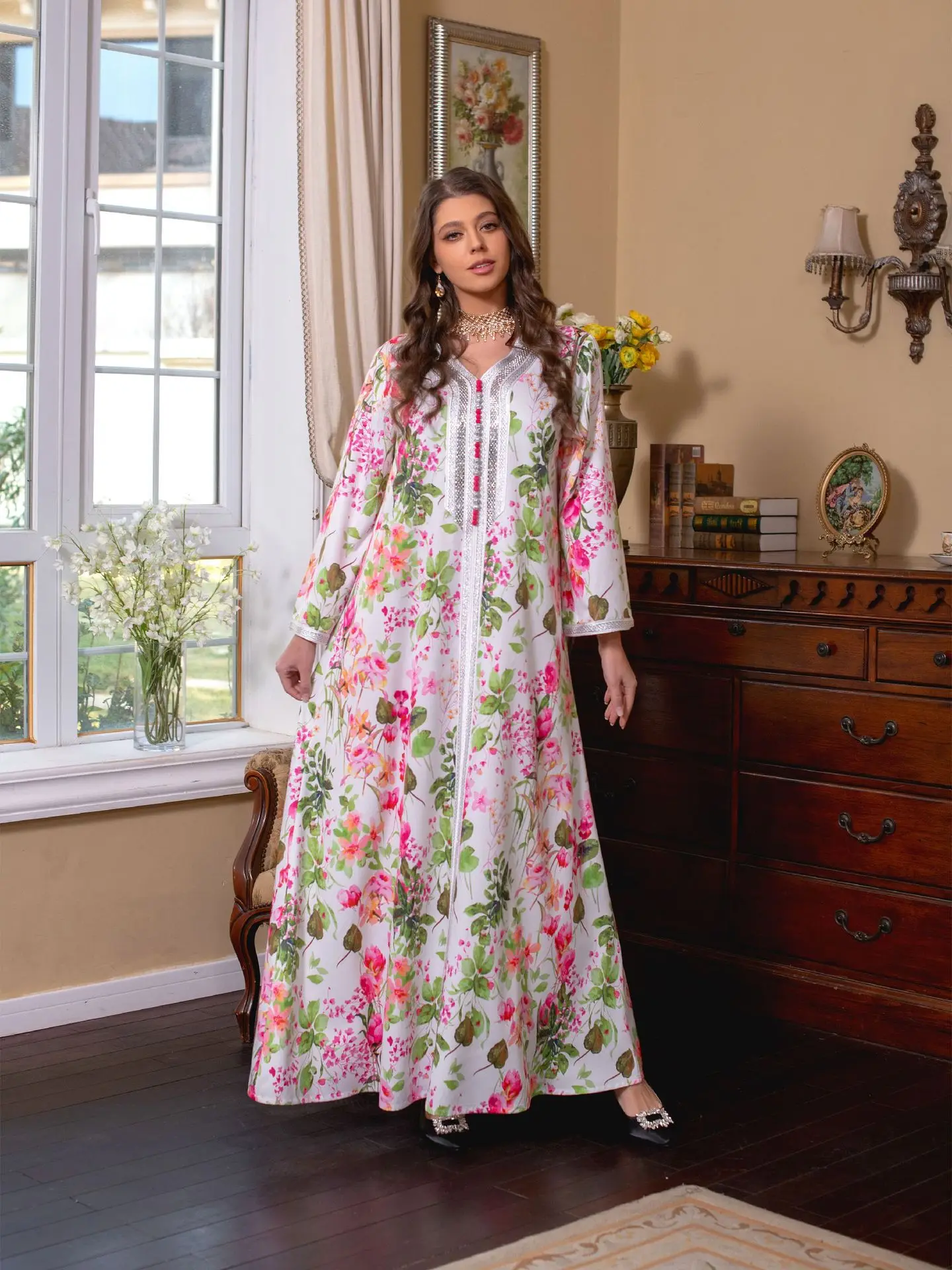 Flowers Printed Abaya Women Muslim Dress Luxurious Rhinestone Arabic Kaftan Maxi Robe Abaya Ramadan Clothing