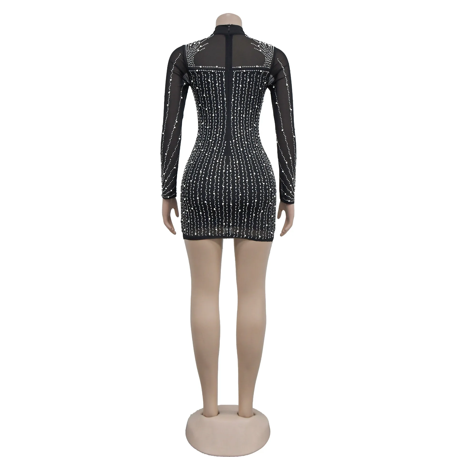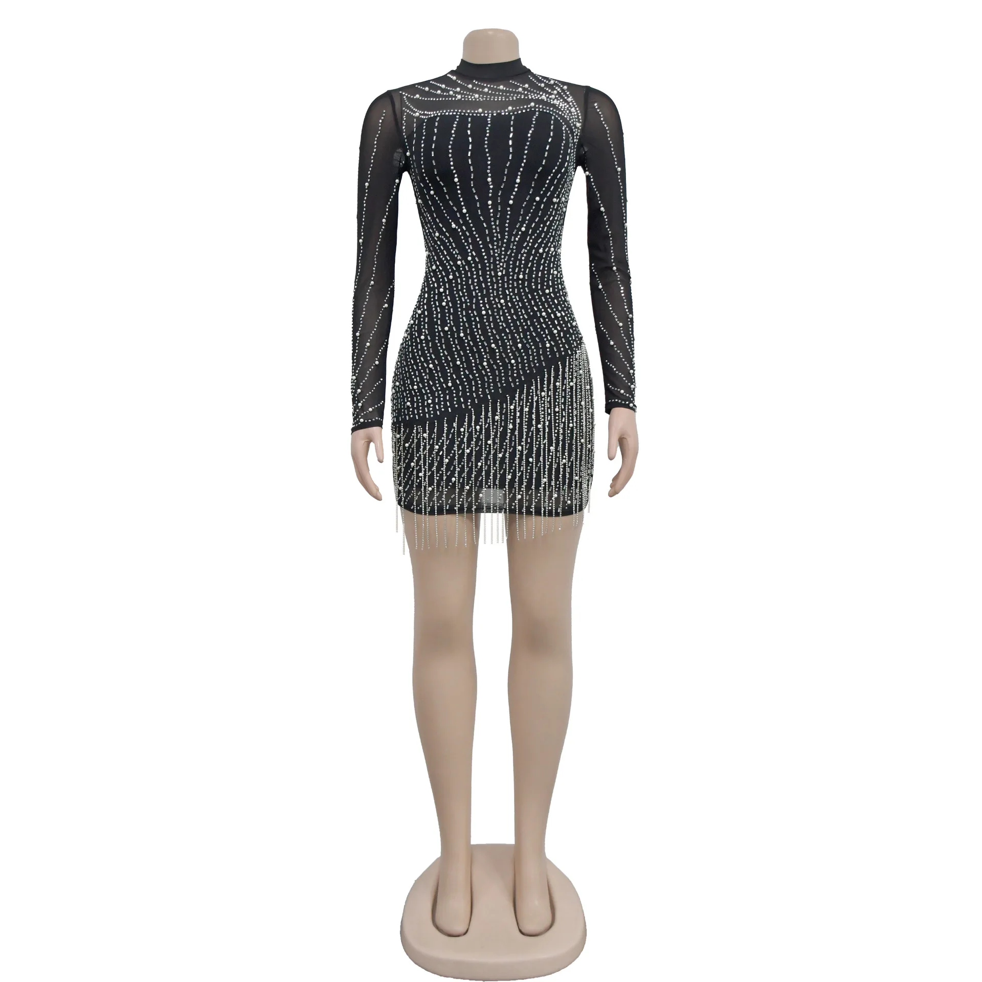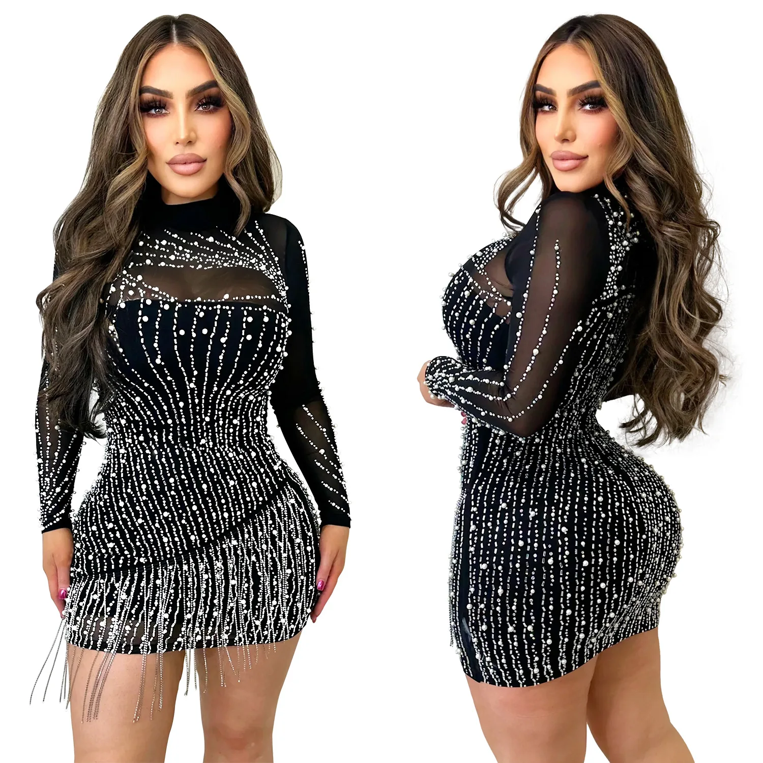In Stock Women Sexy Night Club Party Dress Long Sleeve Rhinestone Beads Evening Bodycon Ball Gown Prom Dress