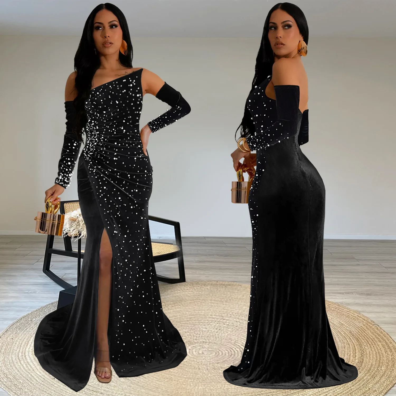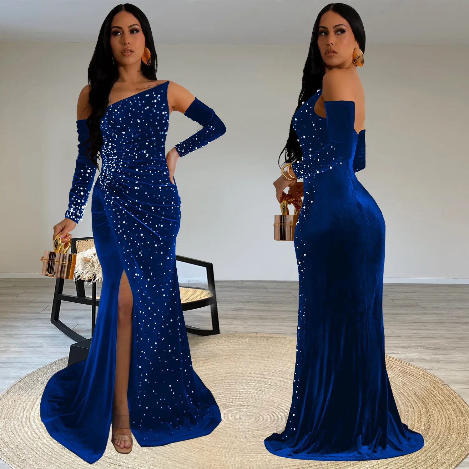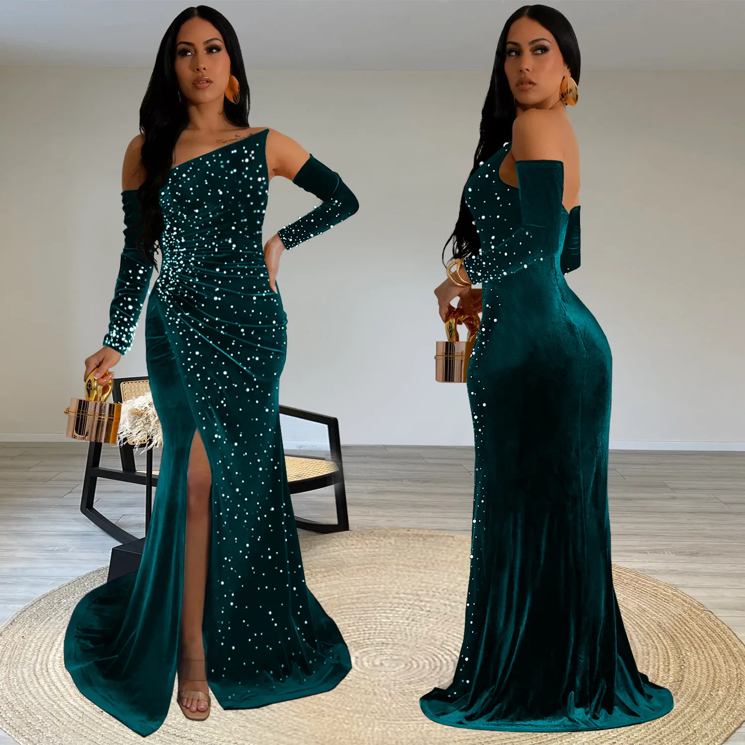 Wholesale Spaghetti Strap Evening Gown Dress Sleeveless Velvet Party Dress with Gloves
