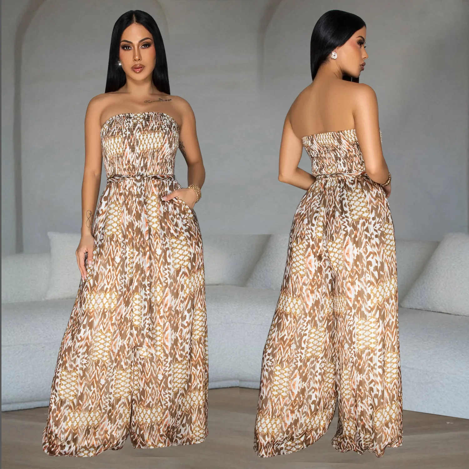 ZYHT 73957 Hot Selling Women Lady Printed Satin Beige Mermaid Fish Tail Floor Length Party Cocktail Evening Dress Gown