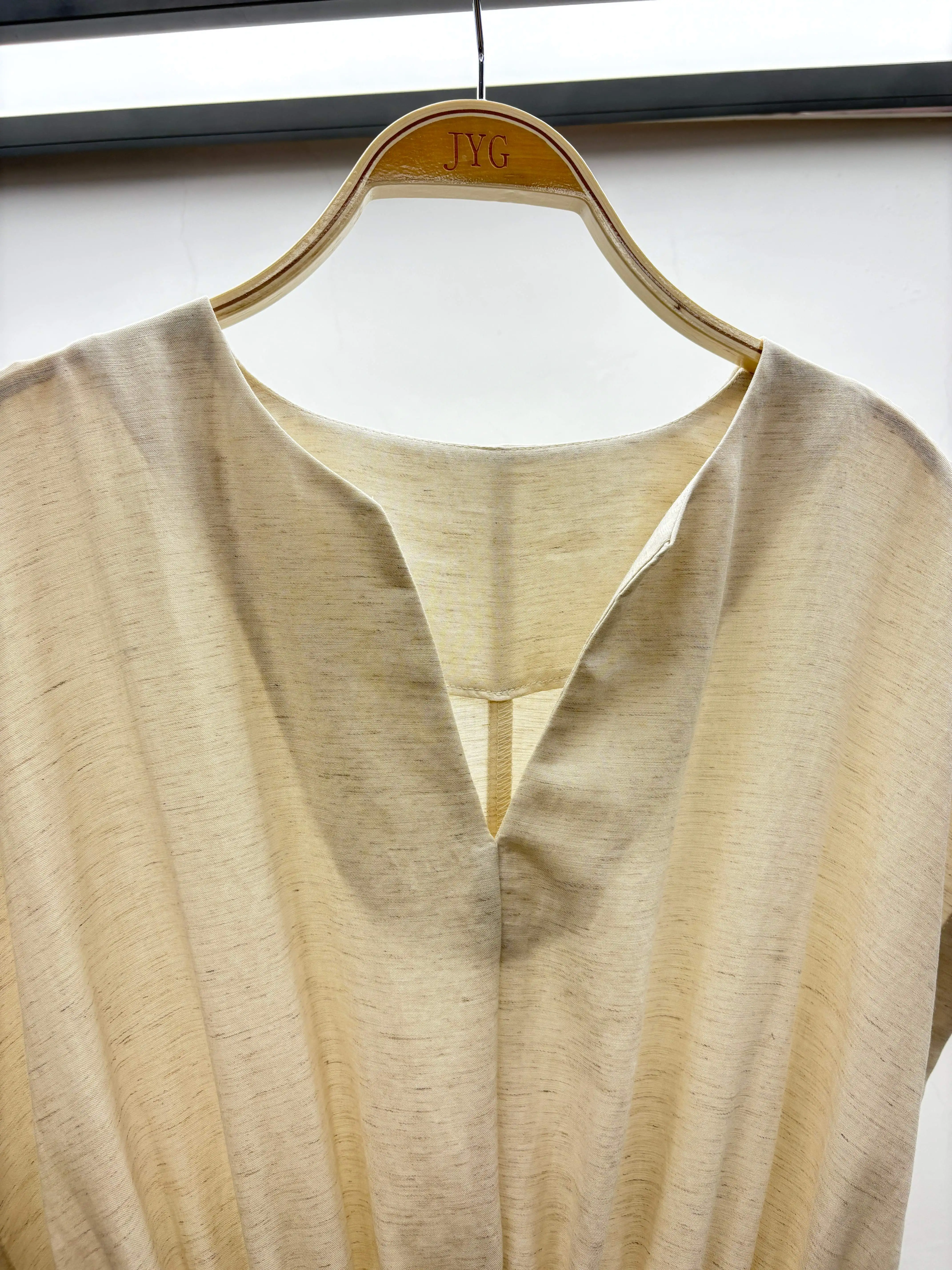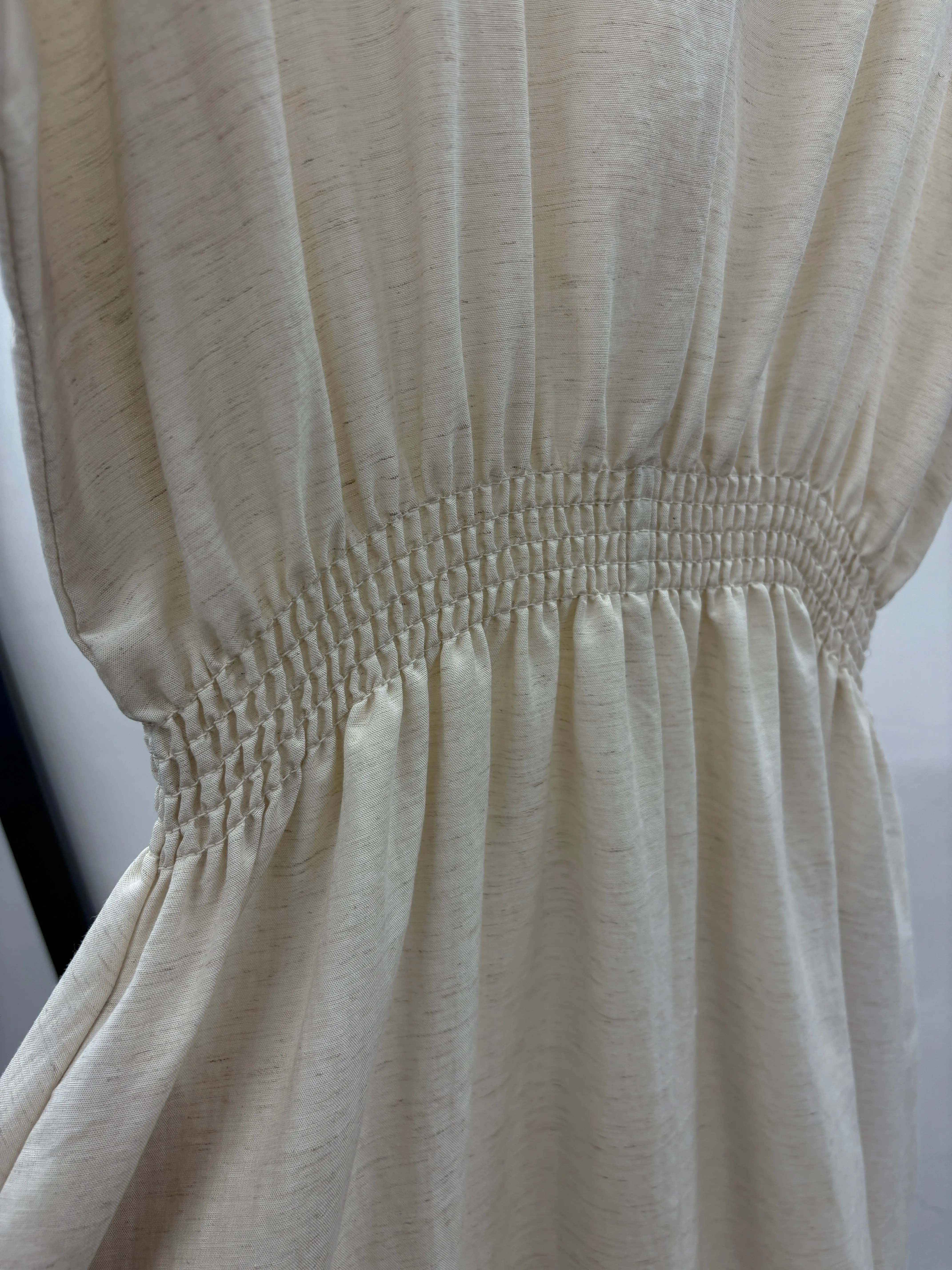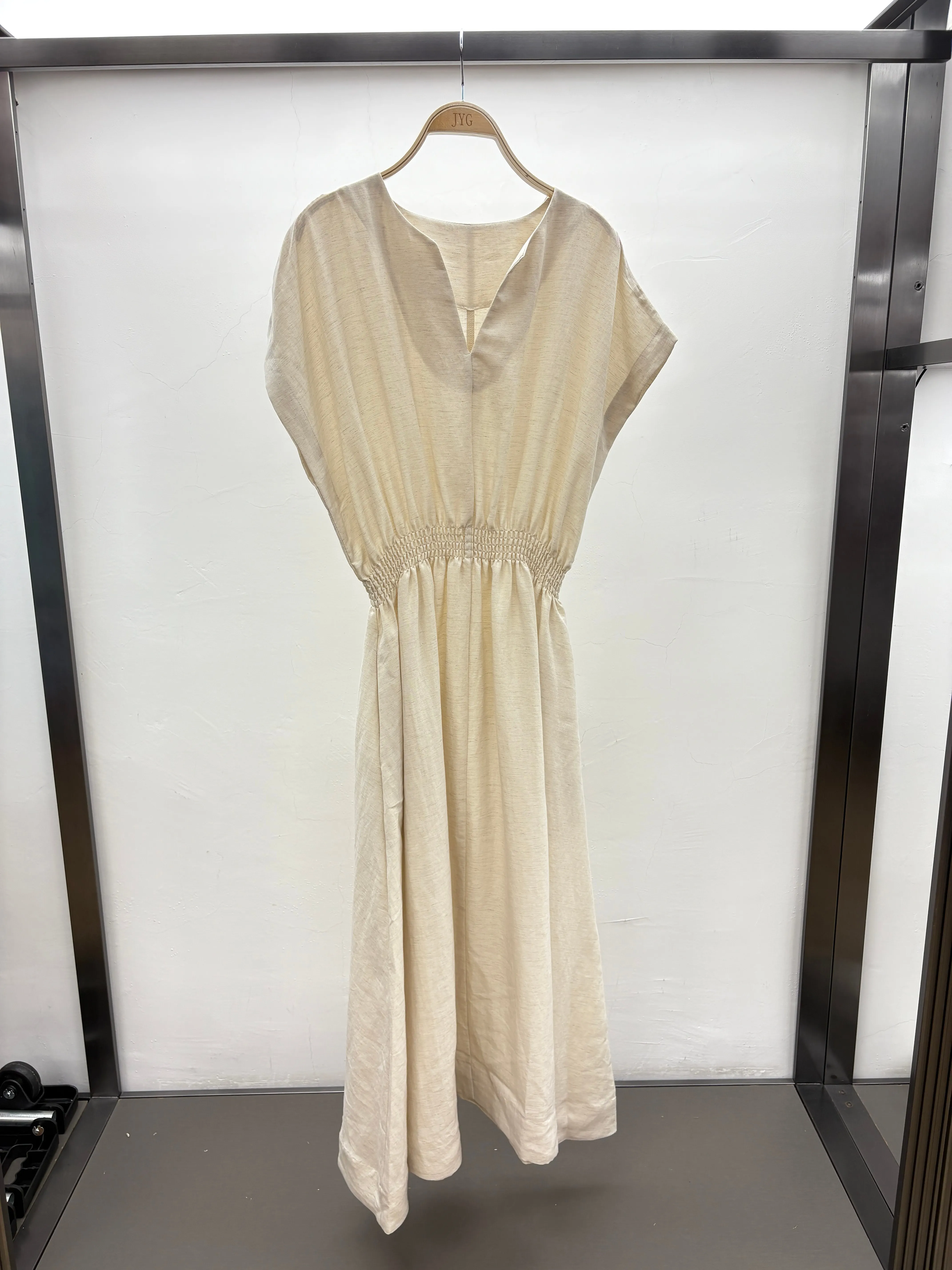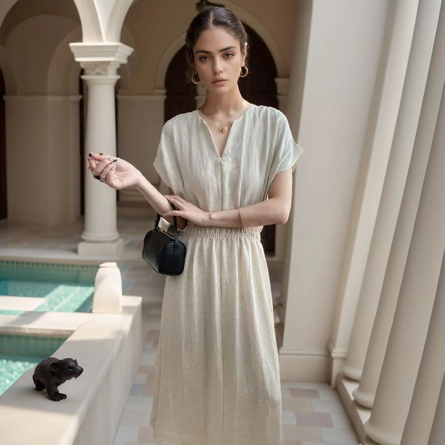 Sustainable Eco Friendly Linen-Blend Solid V-Neck Short Sleeve Shirred Pocket Maxi A-Line High Waist Dress Women Workwear