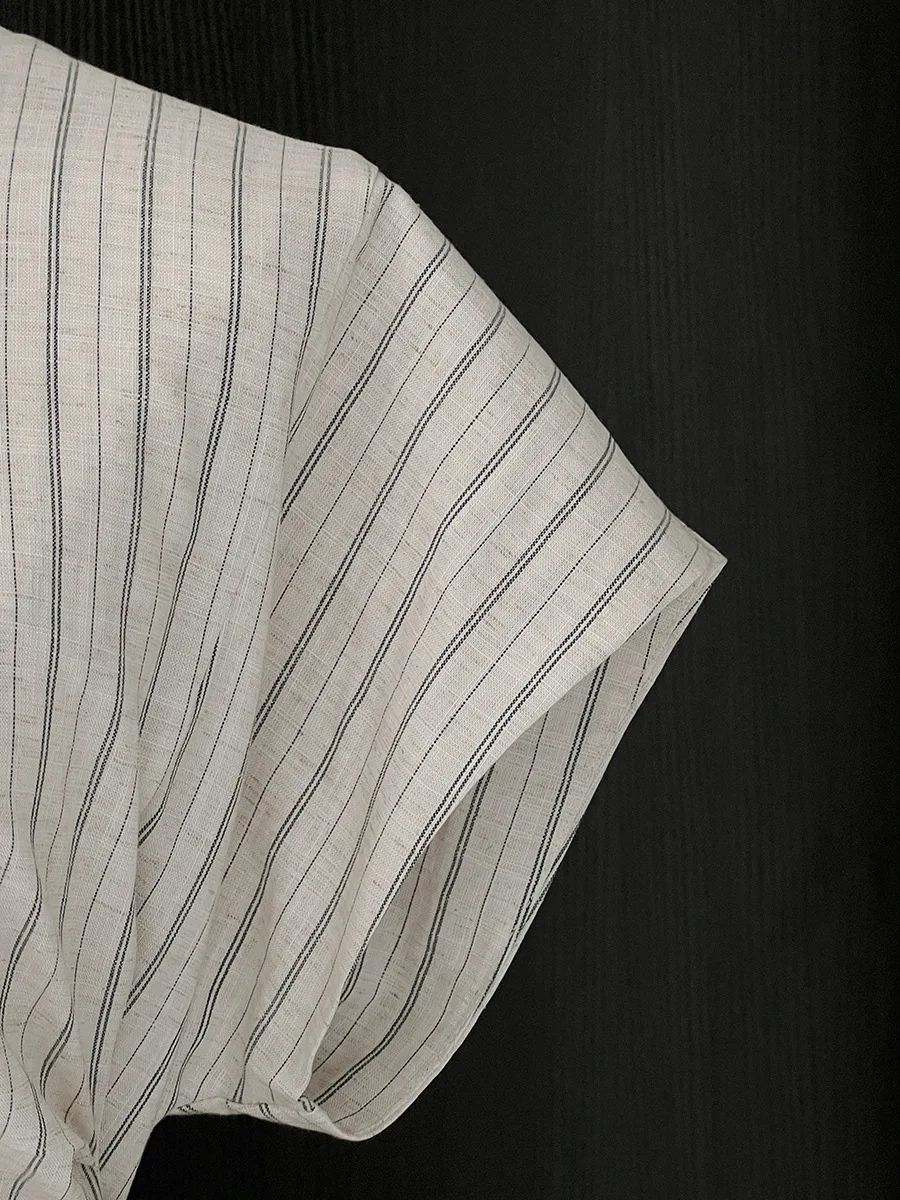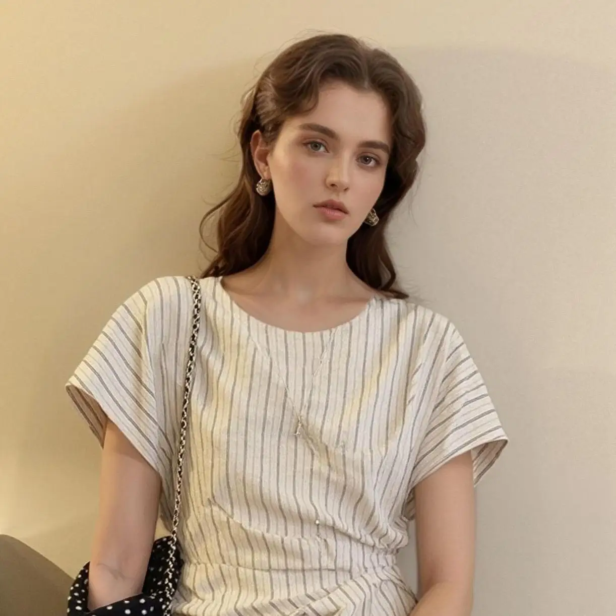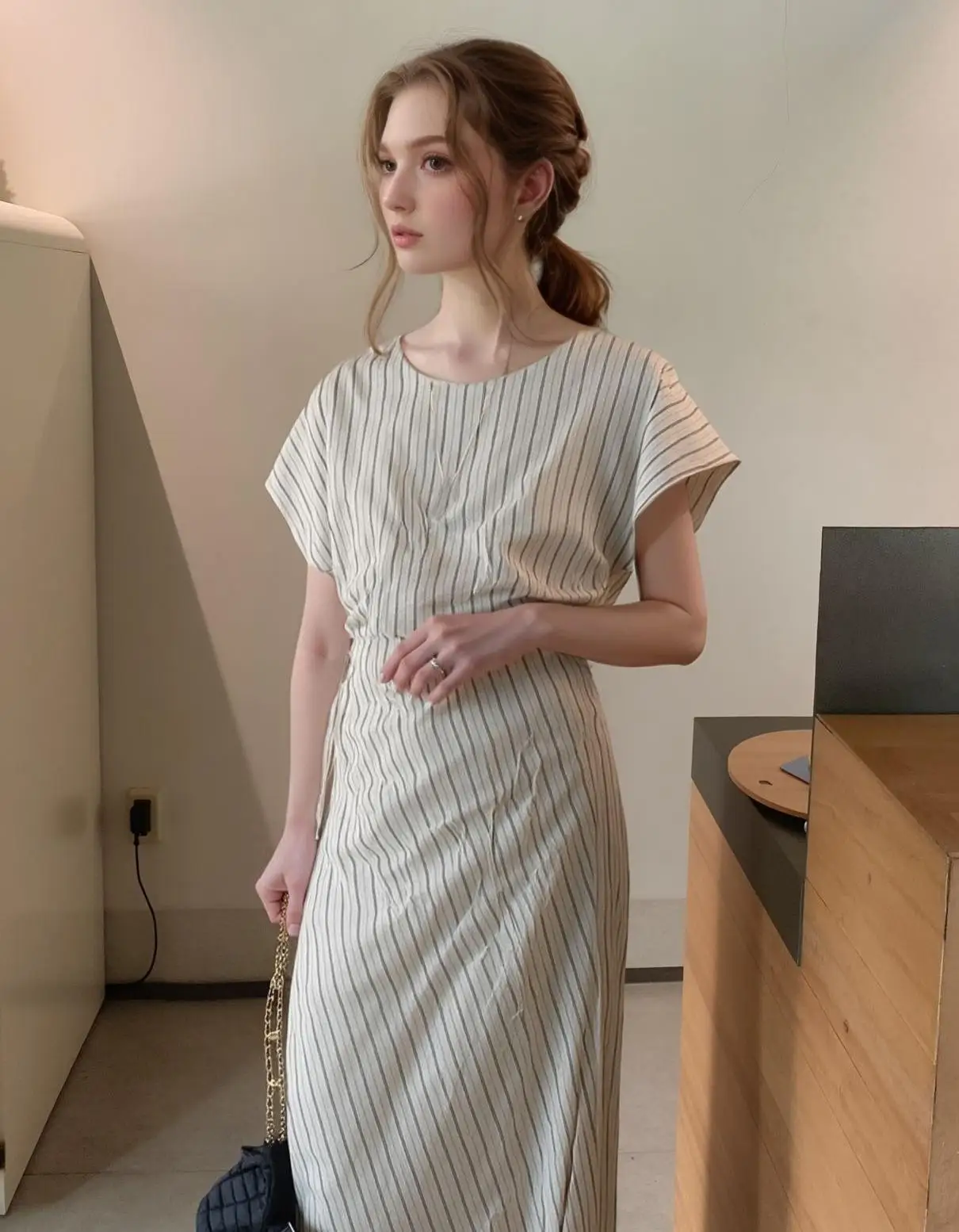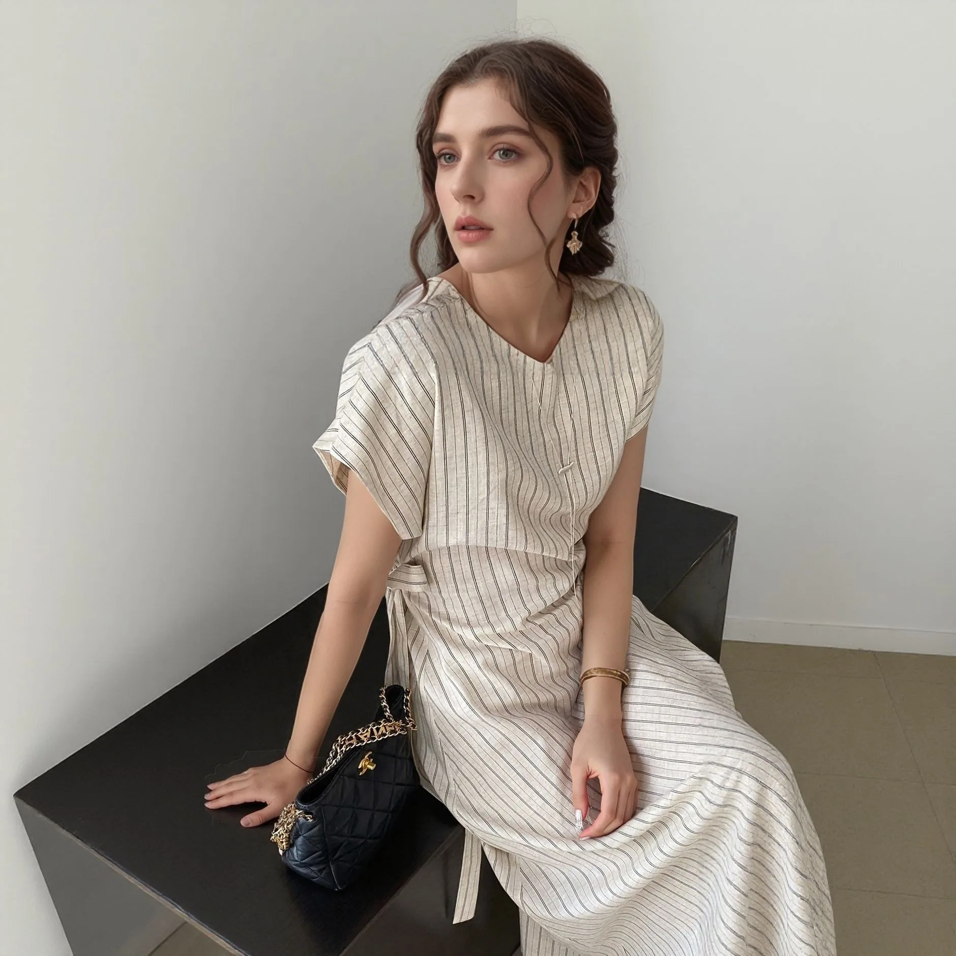Elegant Linen-Blend Round Neck Striped Maxi Dress for Women Online Casual Fashion Wholesale Supply Woven Weaving Method