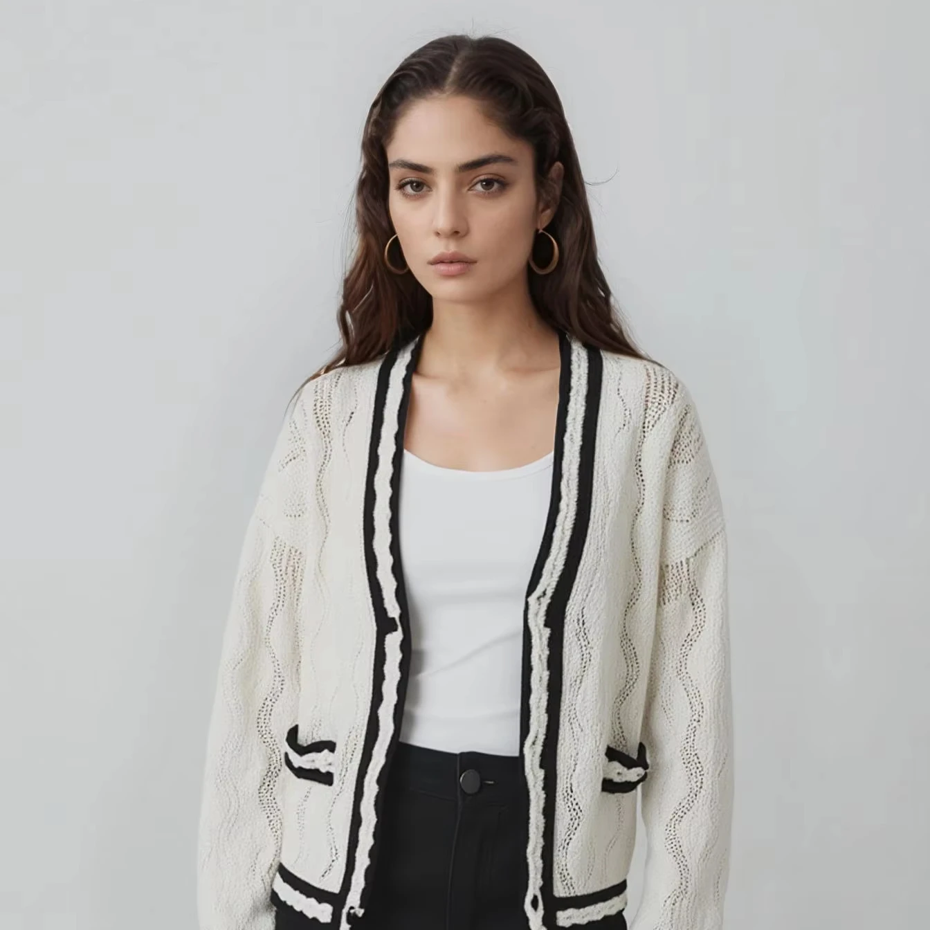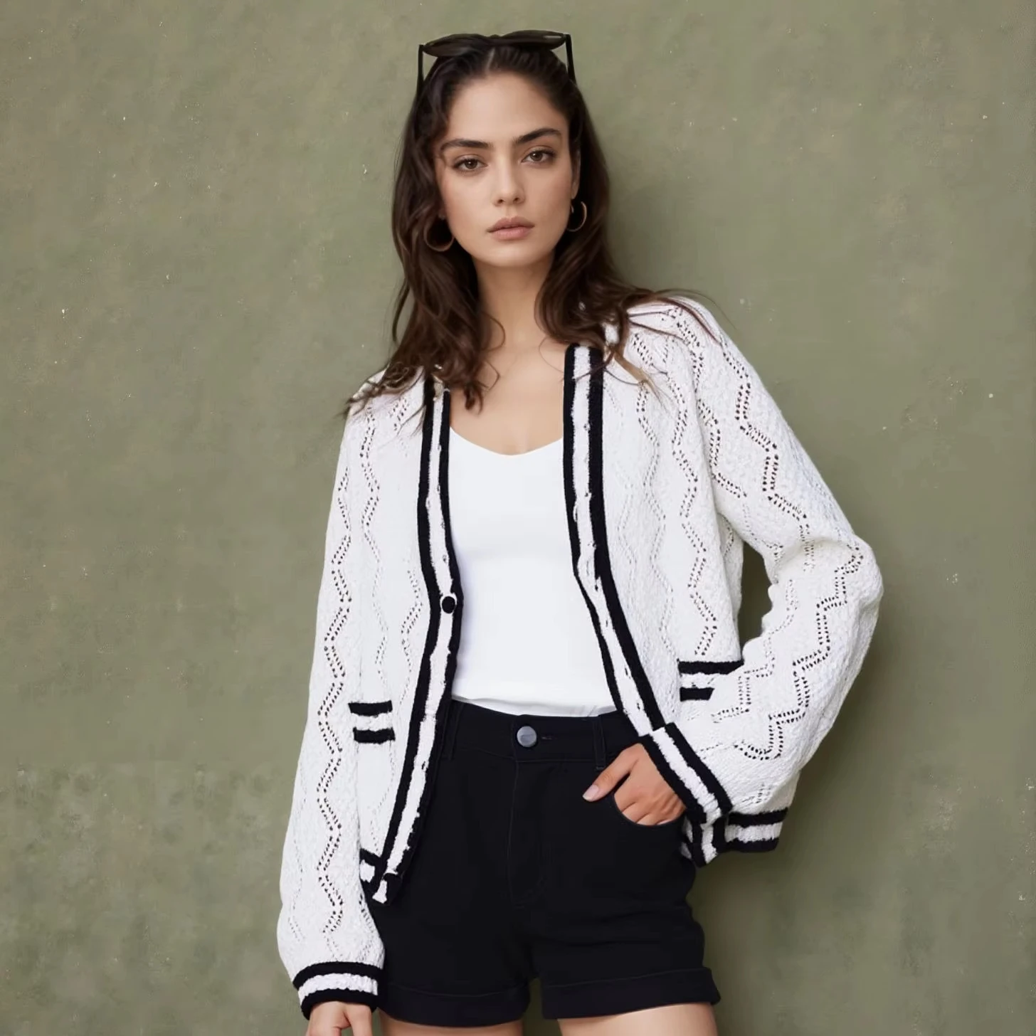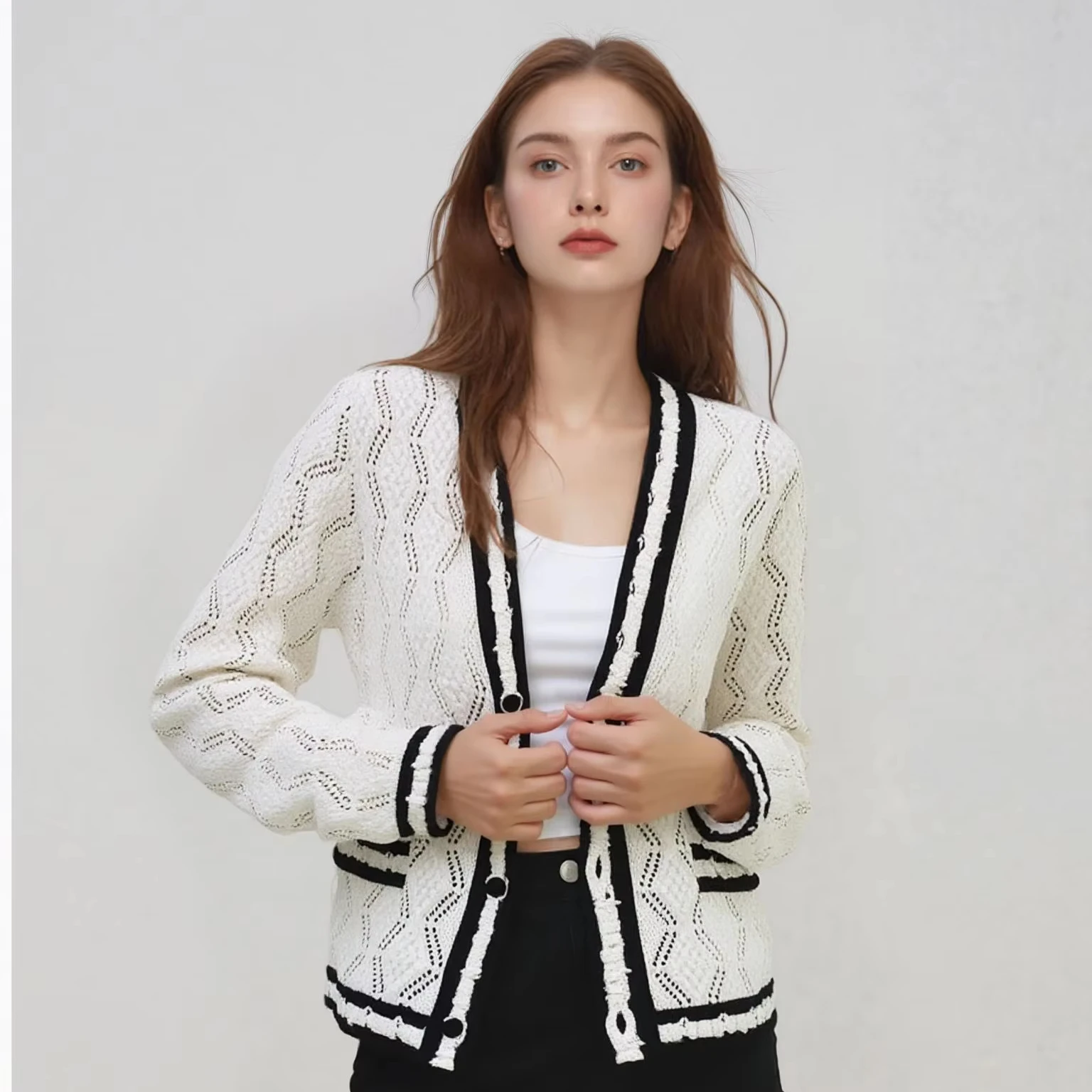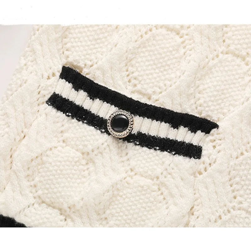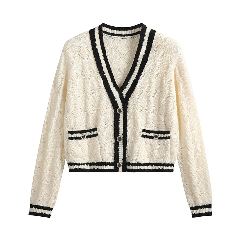 Cotton-Blend Knit V-Neck Colorblock Argyle Tweed Long Sleeve Cardigan Crocheted Striped Pattern for Autumn Season