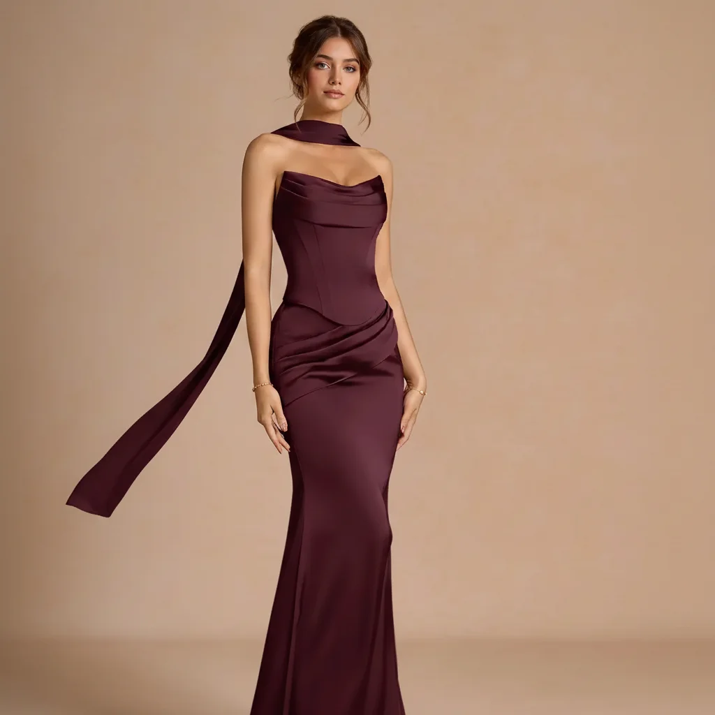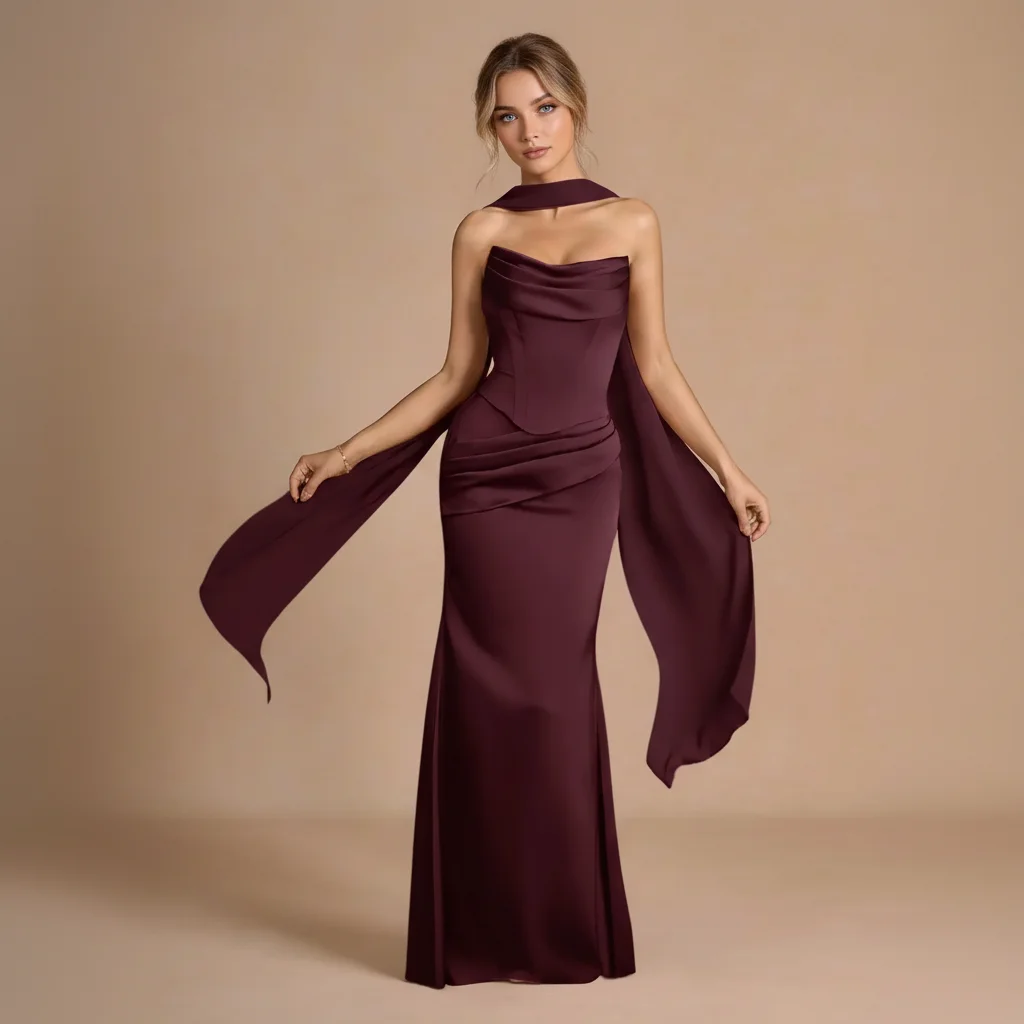 ZYHT 73957 Hot Selling Women Lady Printed Satin Beige Mermaid Fish Tail Floor Length Party Cocktail Evening Dress Gown