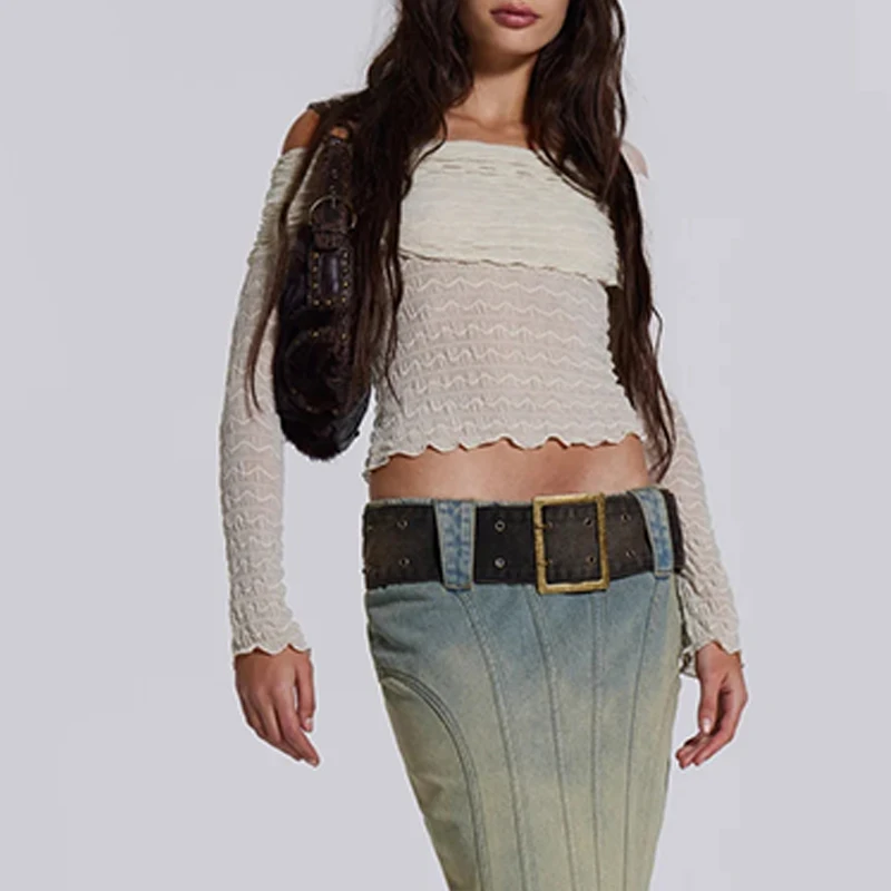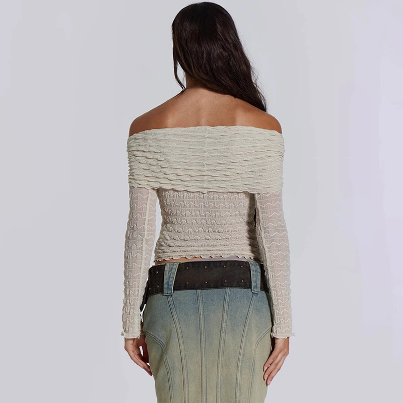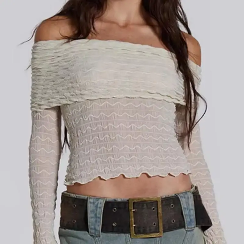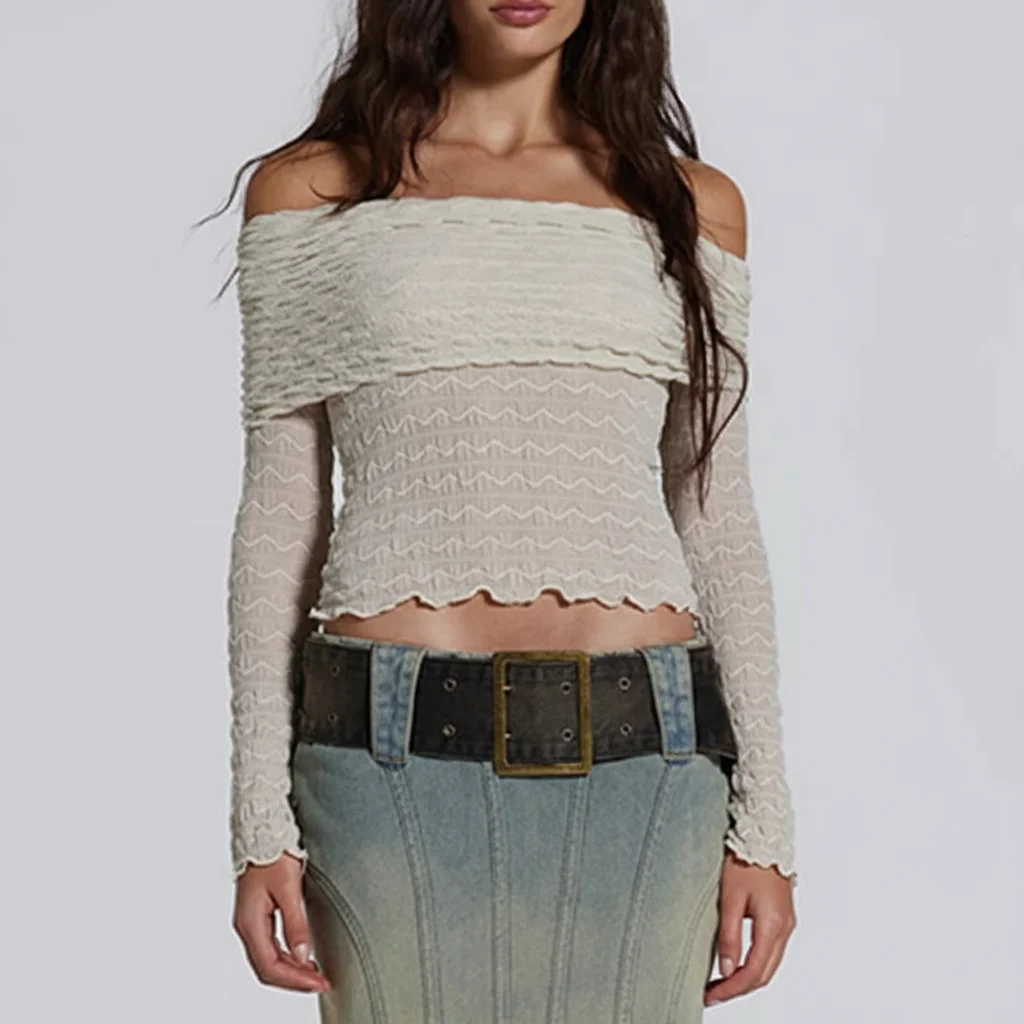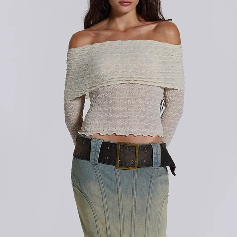 China Manufacturer Fashionable Off the Shoulder Women Tops Long Flared Sleeves Ruched Women Tops and Blouses