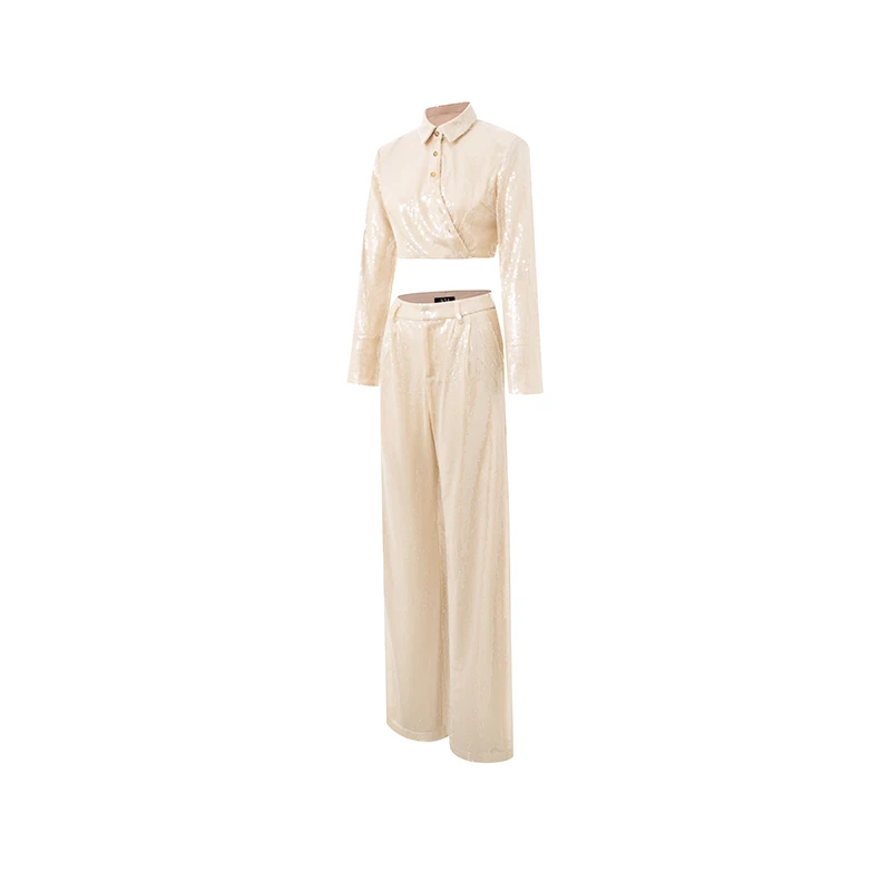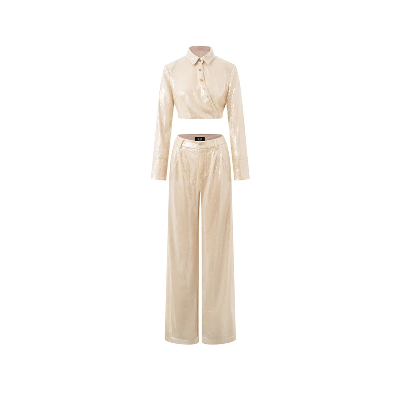 Custom Logo Lapel Women's Sets Casual Outfits Long Sleeve Tops Wide Leg Pants Sequin Women 2 Piece Sets Women Two Piece Set