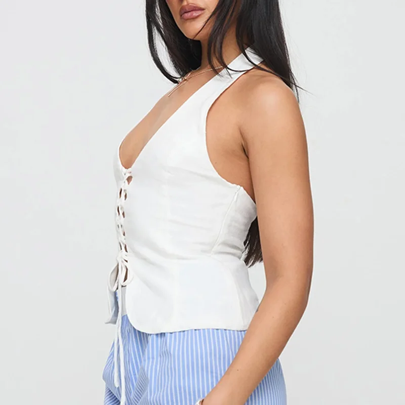 OEM Summer Sleeveless Breathable Tops Neckless V Neck Straps Girl Solid White Top Women Cut-Out Girls Vest Top