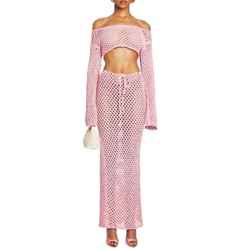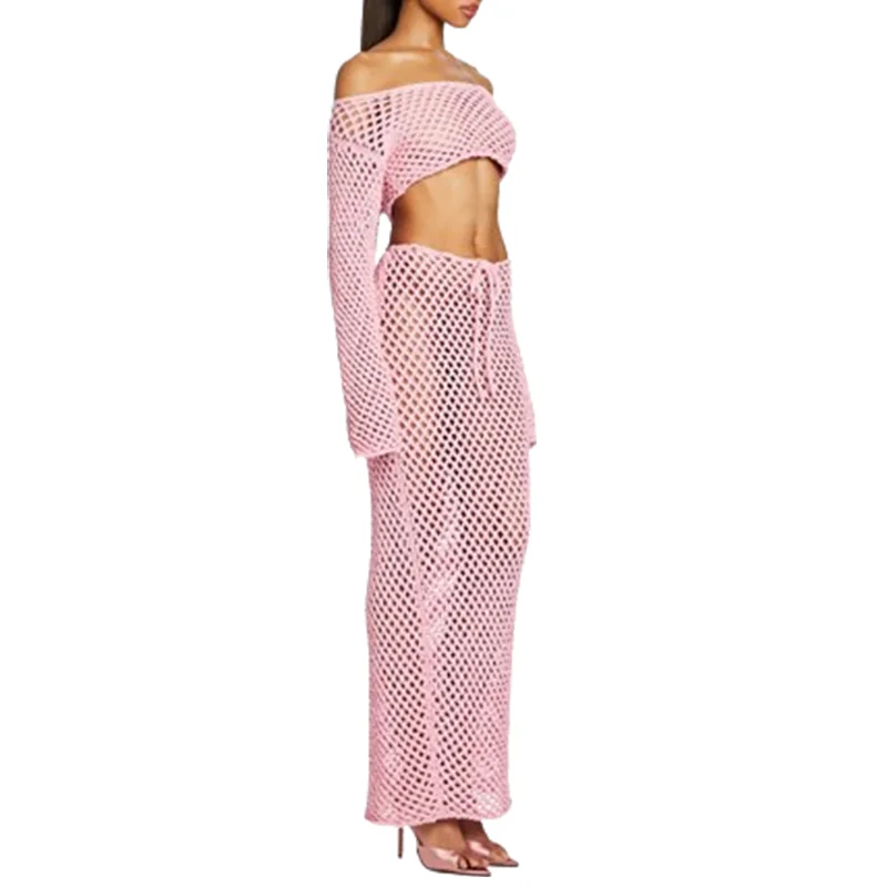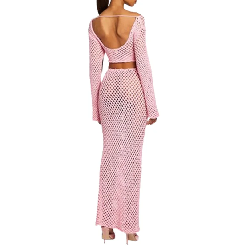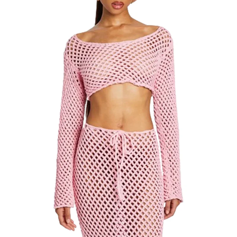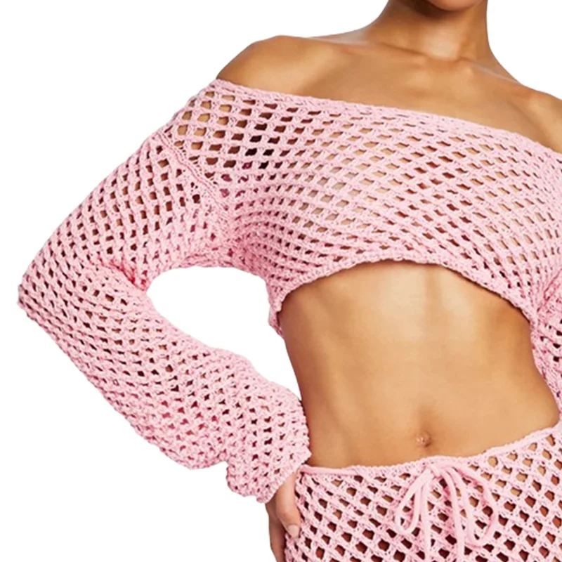 Hot Selling Long Bell Sleeves Knitted Shirt Women Sheer Crew Neck Dropped Shoulder Tops Crochet Knit Boatneck Crop Top