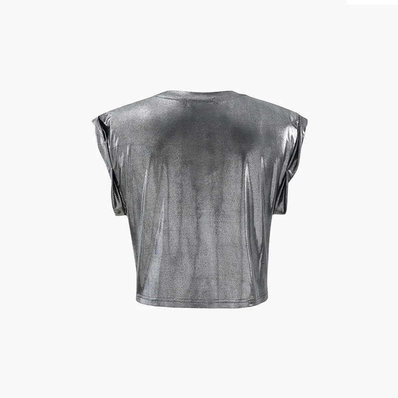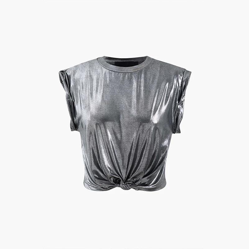 Morden Style Sleeveless T-Shirt for Women Women Metallic Rolled Cuff Knot Hem T-Shirt Allover Ruching Asymmetrical Top