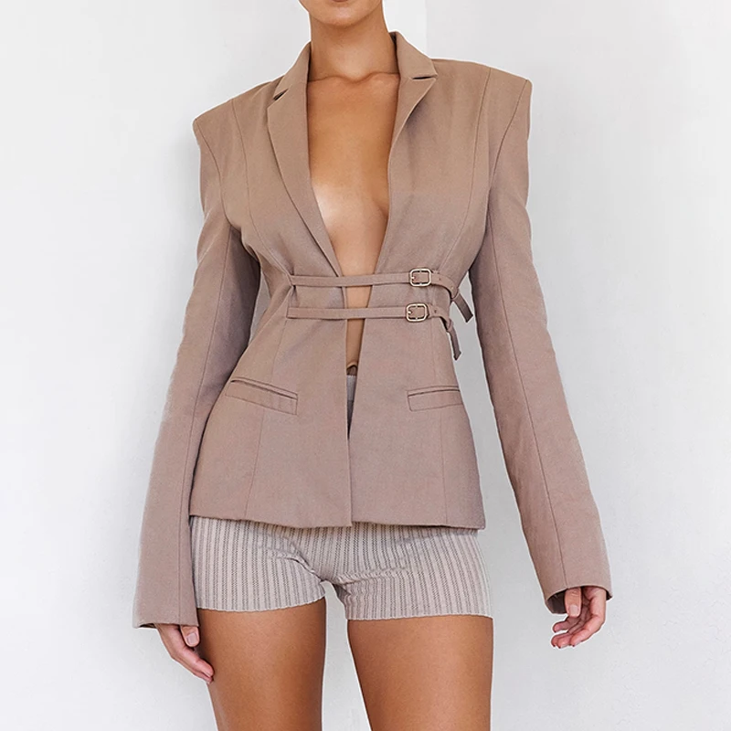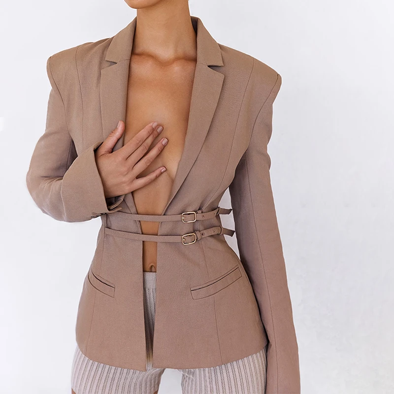 Slim Linen Fabric Women Blazers for Ladies Lapel Woman Blazer With Shoulder Pad V-Neck Buckle Belts Womens Suits