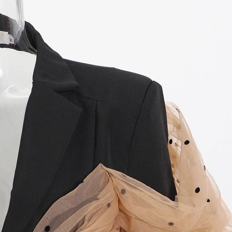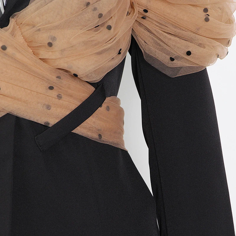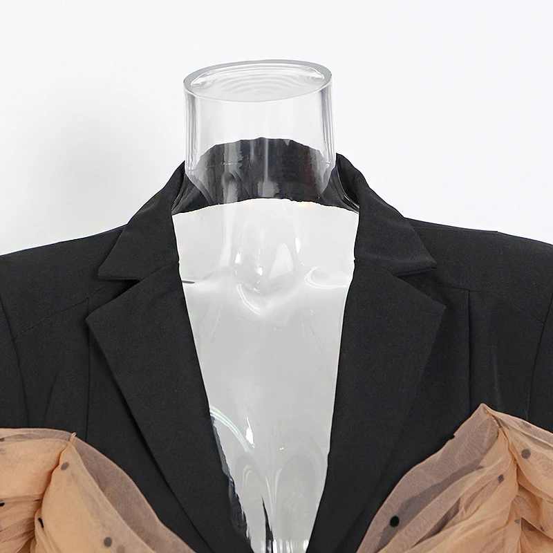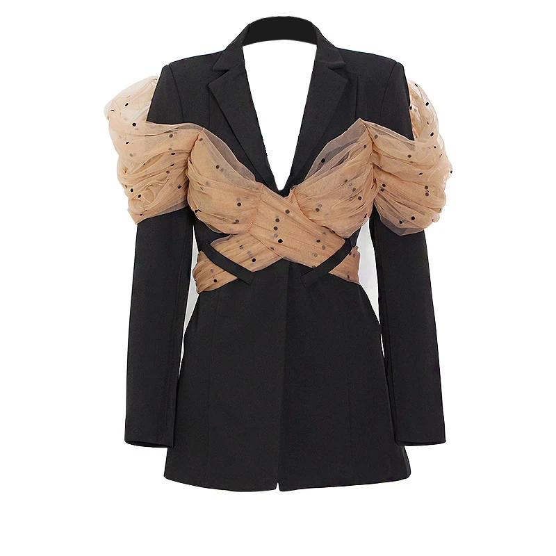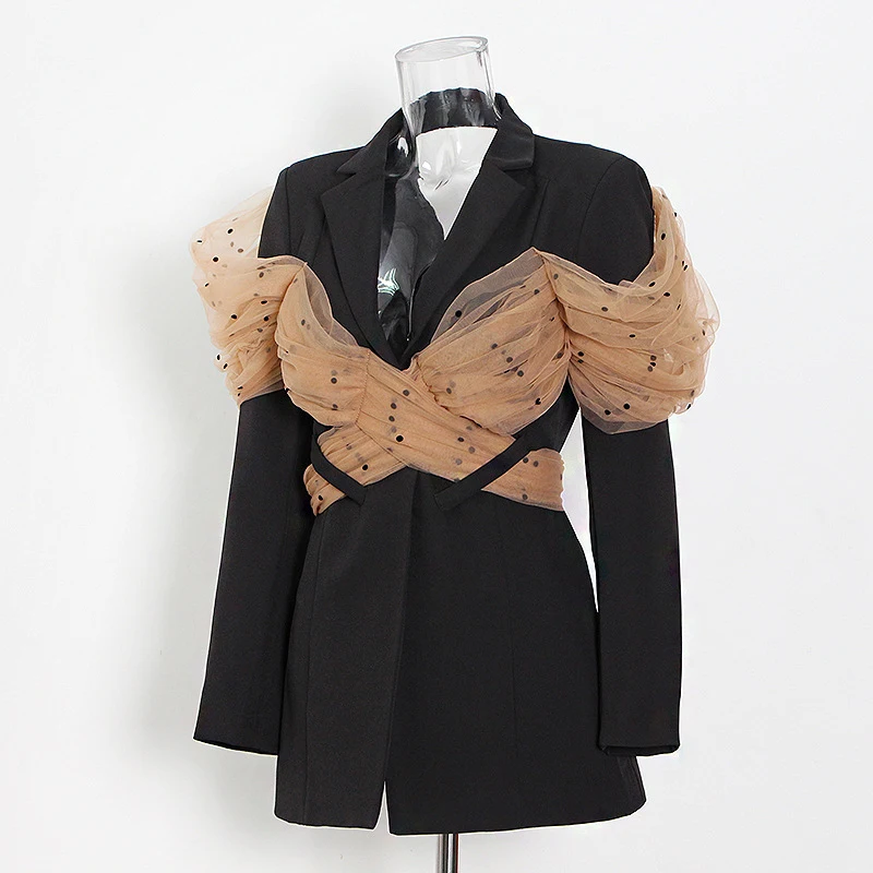 SF AL 24T181 Long Sleeve Women Blazers Jacket Mesh Patchwork Tie up Polyester Lapel Deep-V Women's Suits Blazers