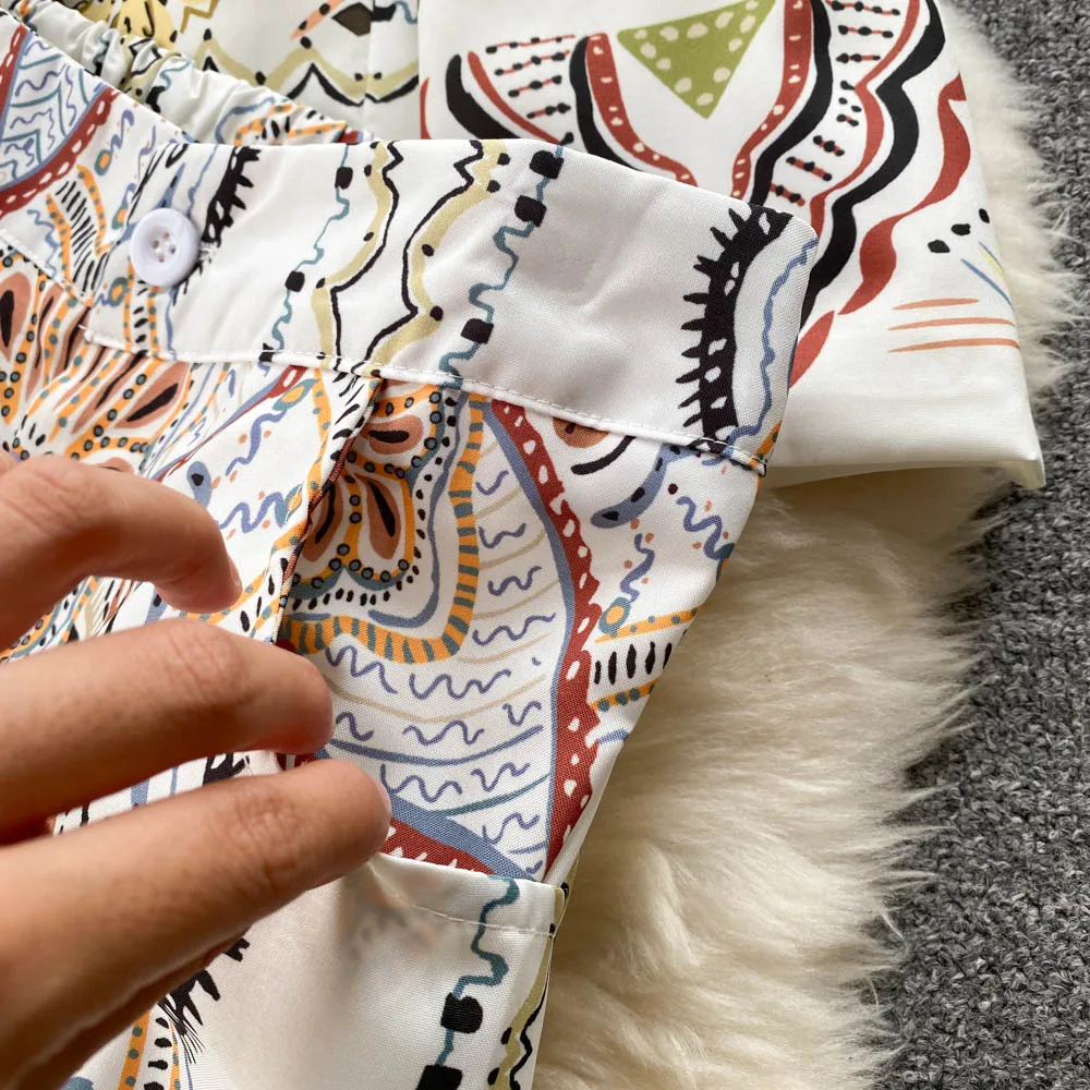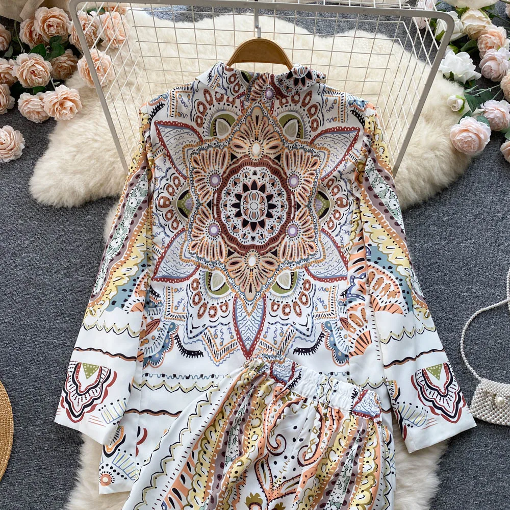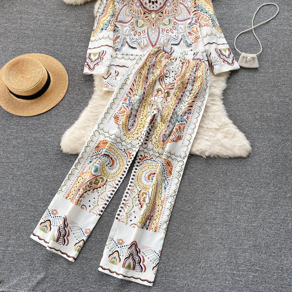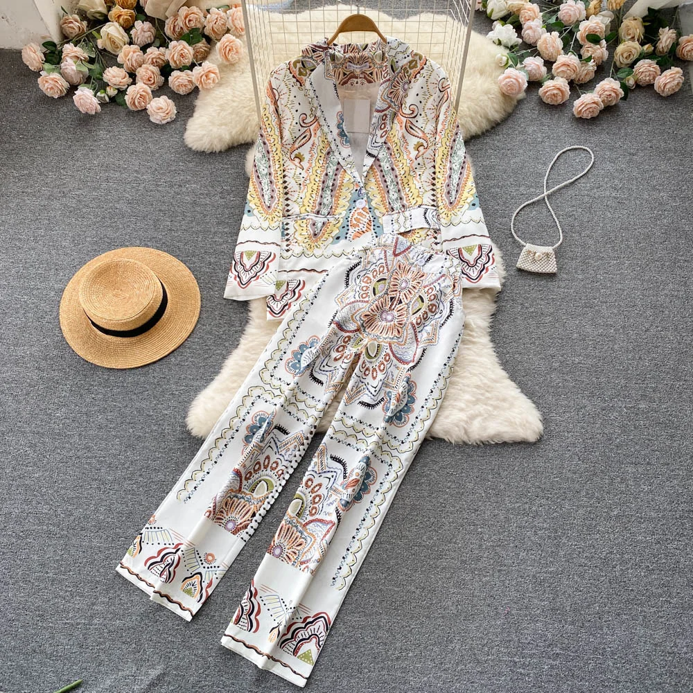 Custom Fashion Western Style Two Suits Ladies Printed blazer High Waisted Wide Leg Trousers