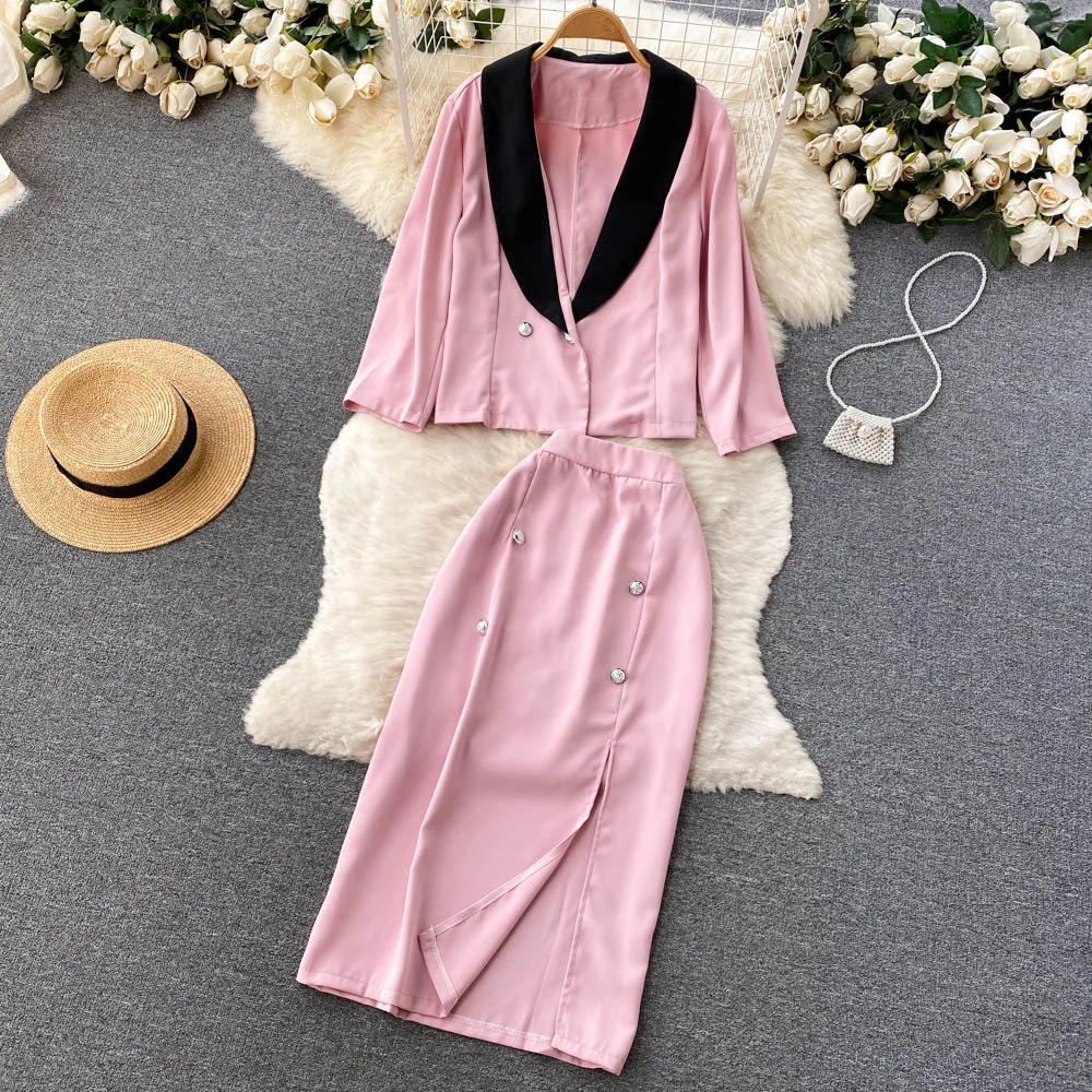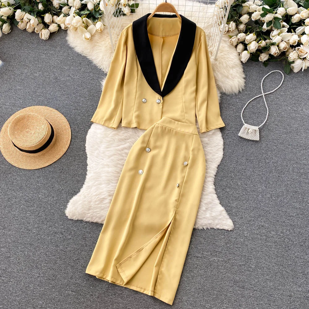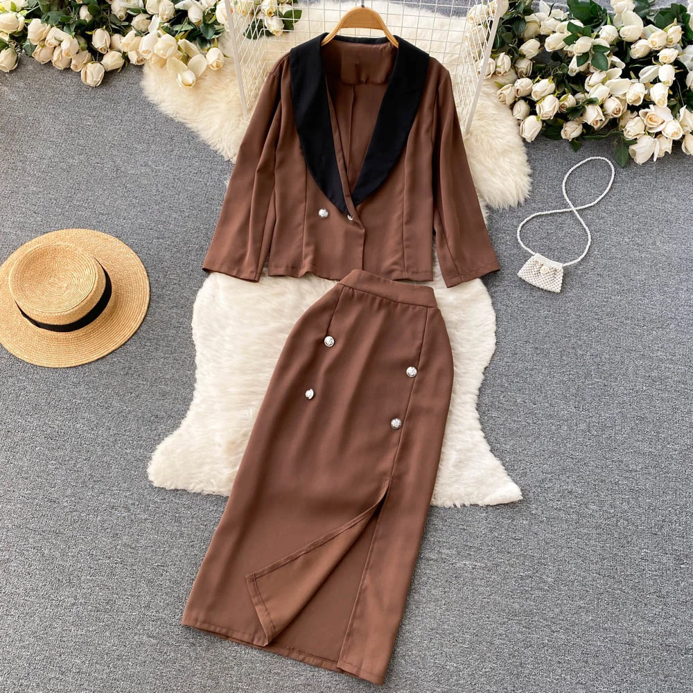 Customized Two Pieces Suit Women's Autumn Style Solid Color Suit Jacket blazer High Waist Long Split Skirt