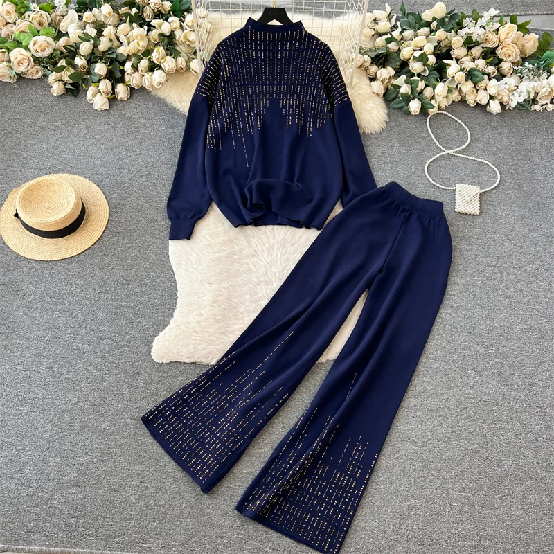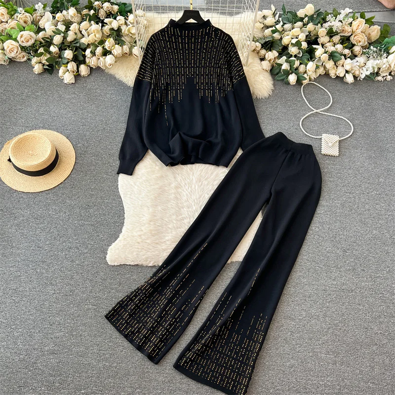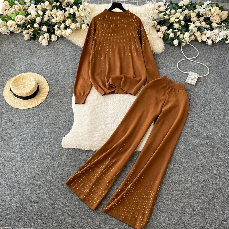 Customized Knitted Fashion Set Women's Autumn Winter Loose T-shirt High Waist Dropped Pants