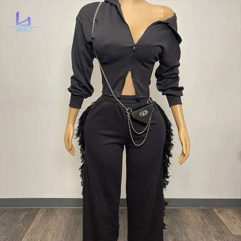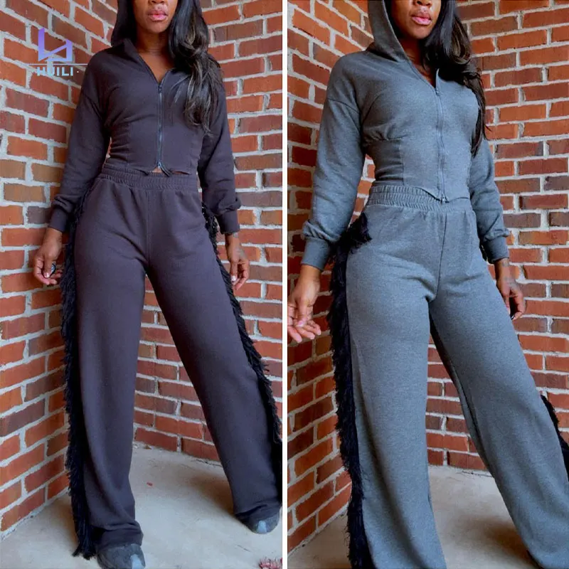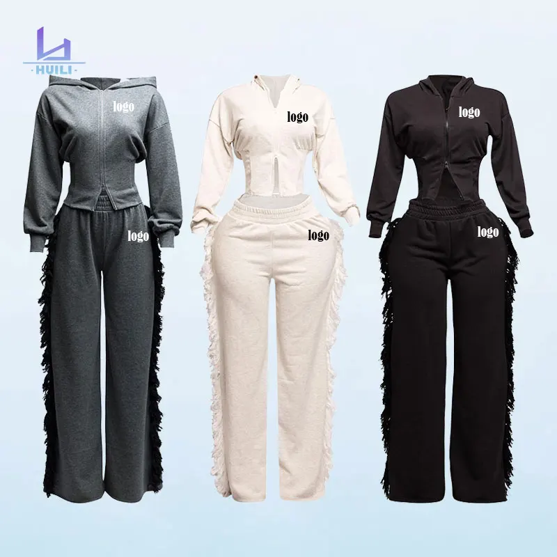 Huili Oem 100% Cotton Sports Two Piece Zip up Slim Fit Cropped Top & Pants Tracksuits 2026 Baggy Sweatpants and Hoodie Set Women