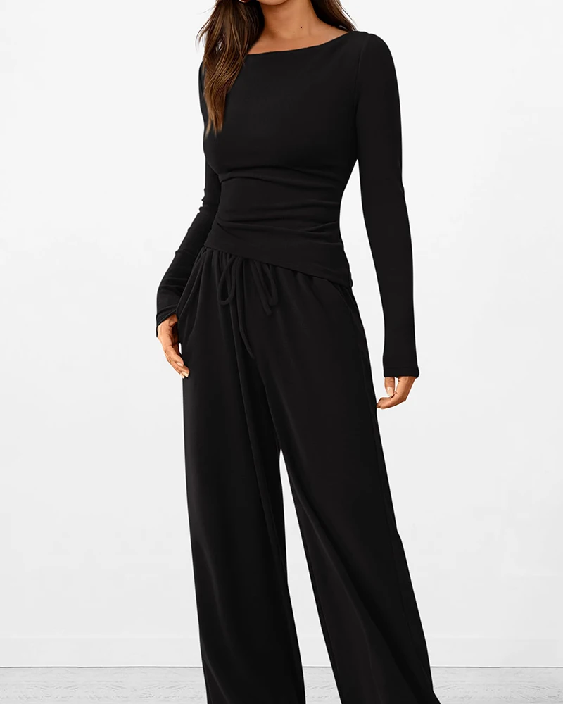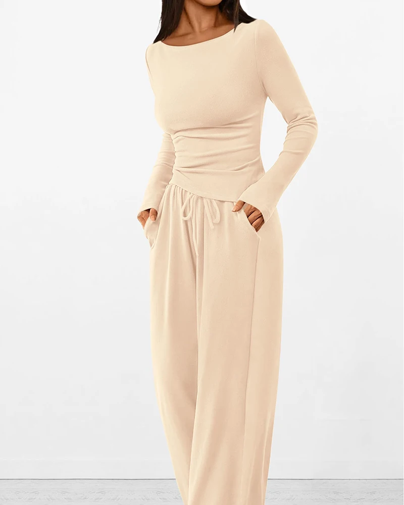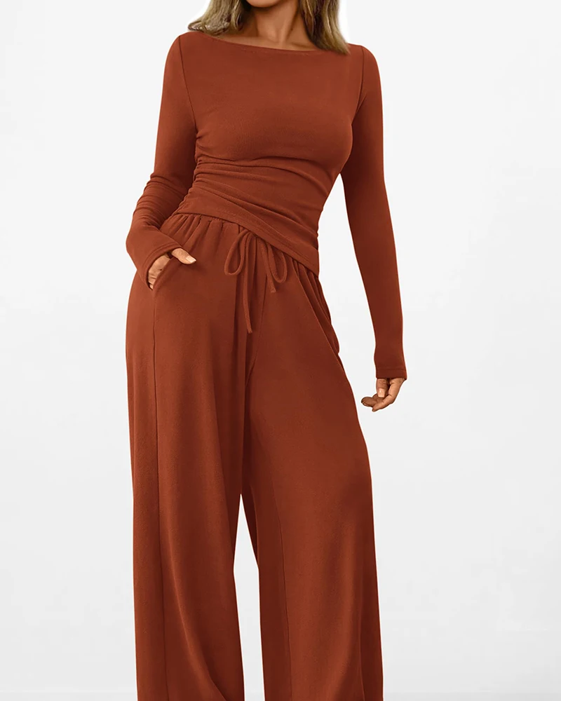 Casual Women's Long Sleeve Round Neck Top + High Waist Wide Leg Pants 2 Piece Set Lounge Soft Stretch Loungewear for Daily Wear
