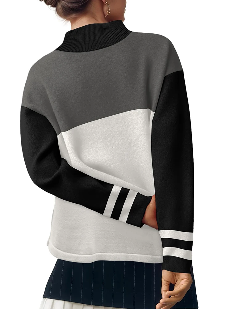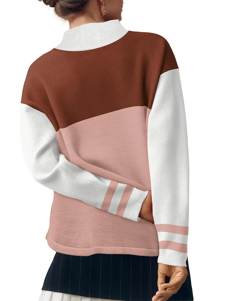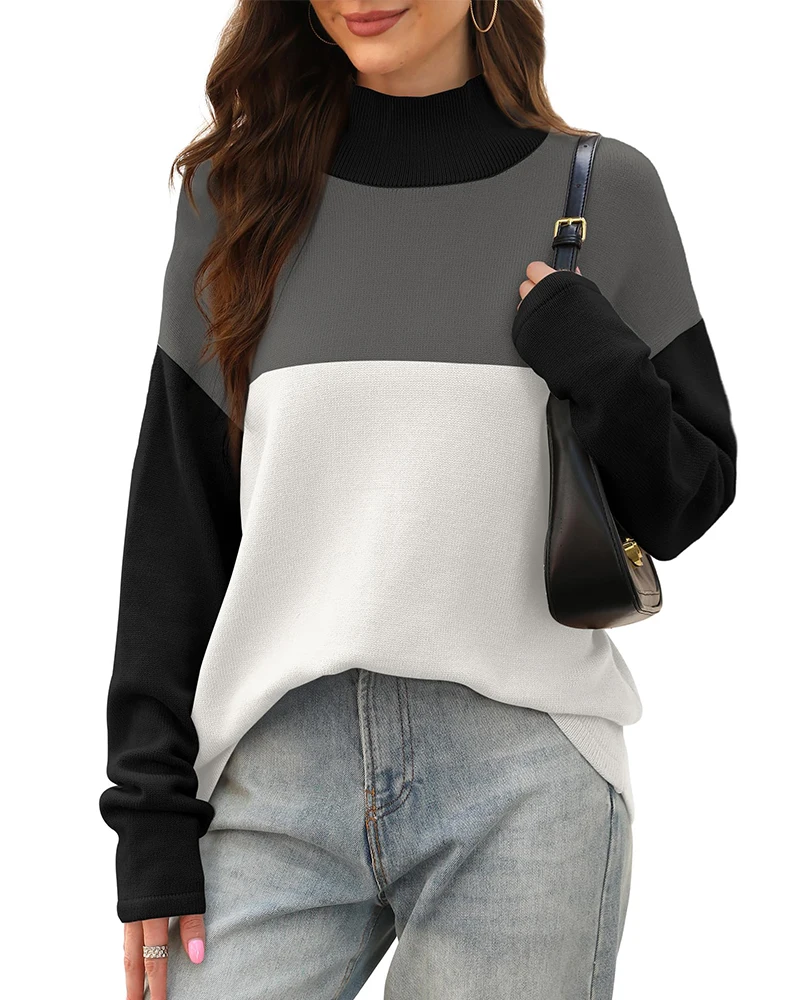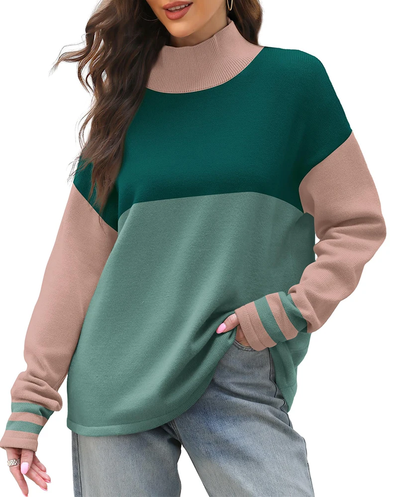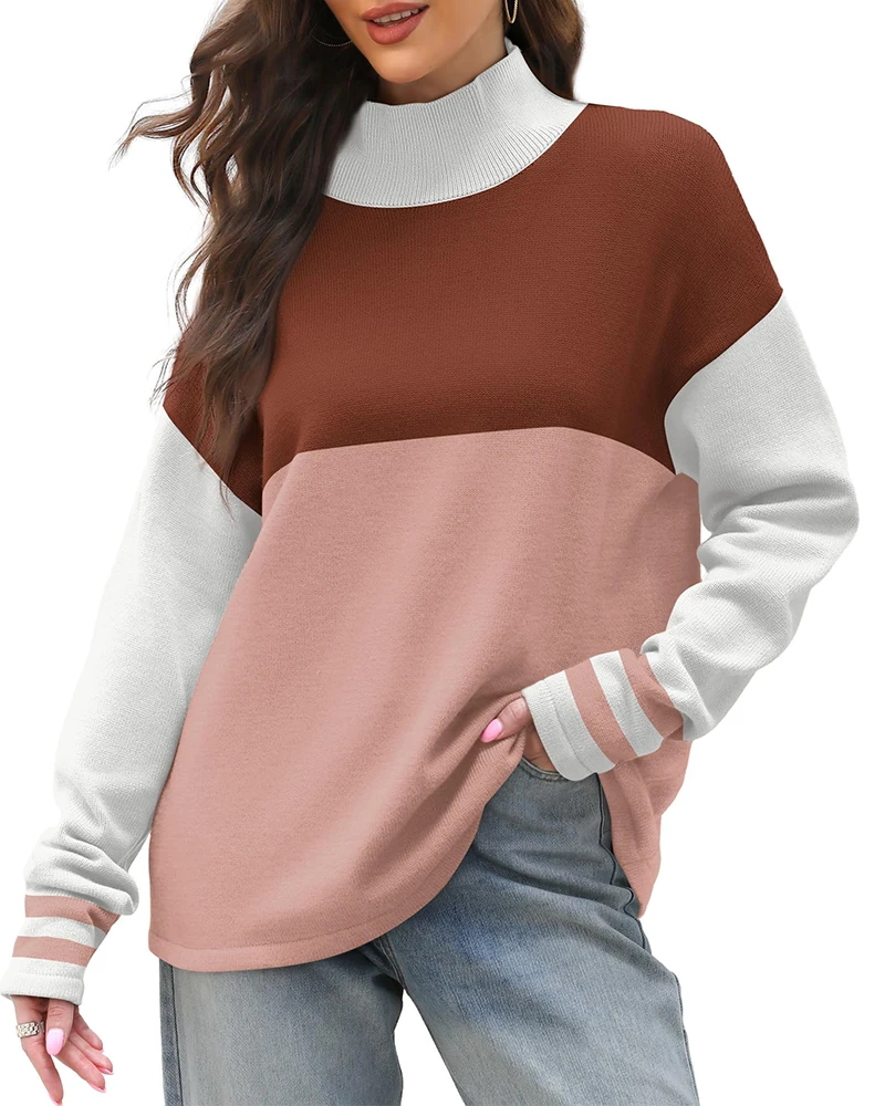 Fashion Autumn and Winter Women's Turtleneck Color Block Round Neck Sweater Casual Oversize Long Sleeve Loose Knit Pullover