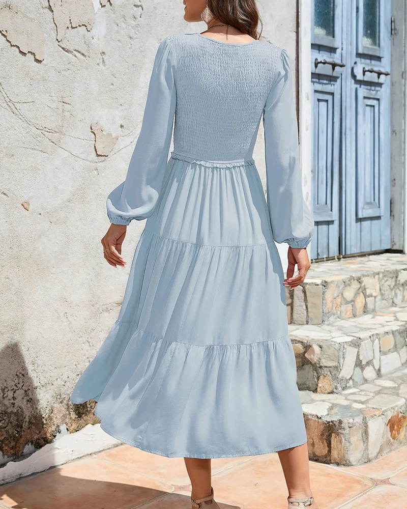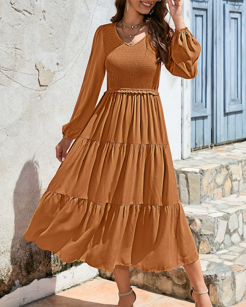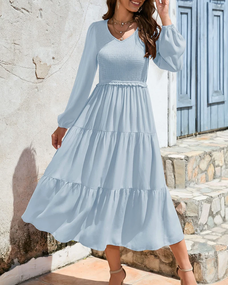 Elegant Women's Long Sleeve V Neck Tiered Maxi Dress Flowy Casual Loose Solid ColorSpring Autumn Party Daily Midi Dresses