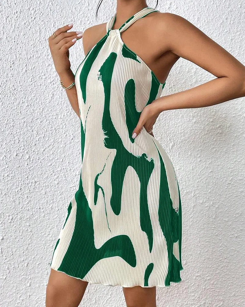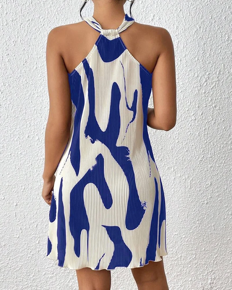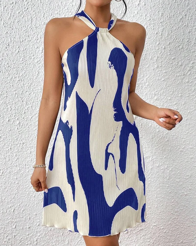 Women's Halter Neck Pleated Mini Dress Abstract Print Sleeveless Summer Casual Party Clubwear a Line Loose Fit Multi Color Dress