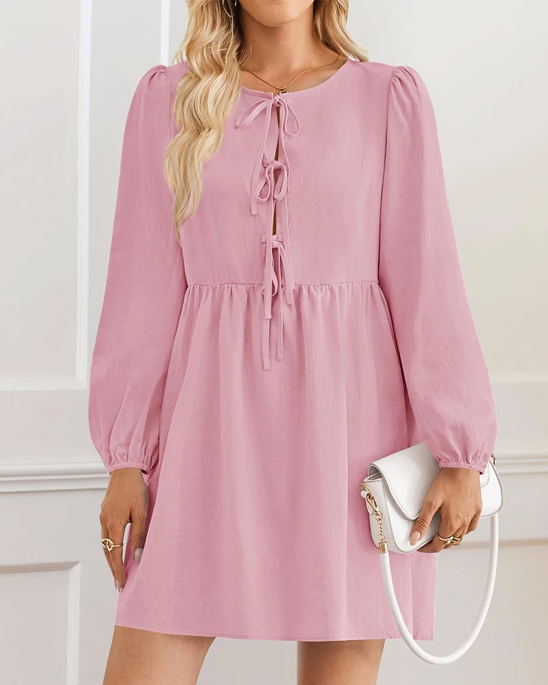 Young Ladies Dress for Summer Slid Color O-neck Long Sleeve A-line Dresses with Bow Tie and Hidden Button
