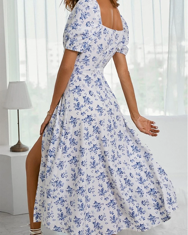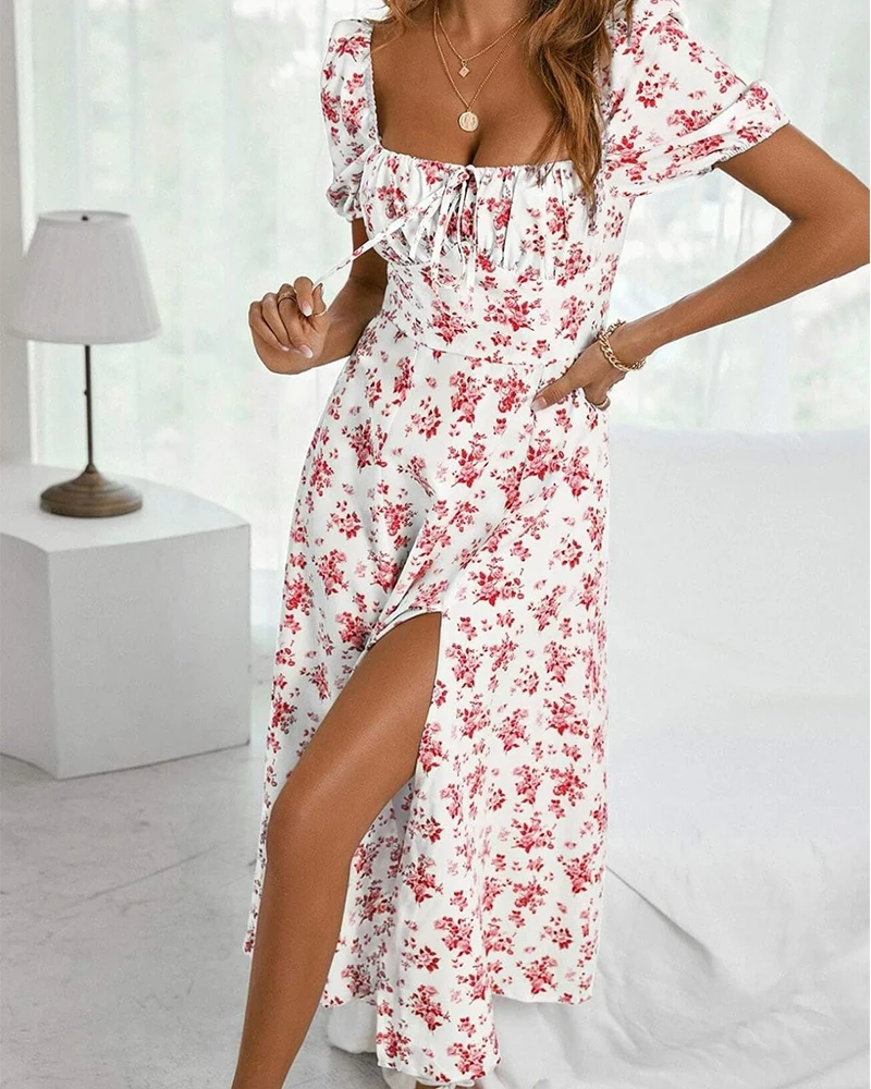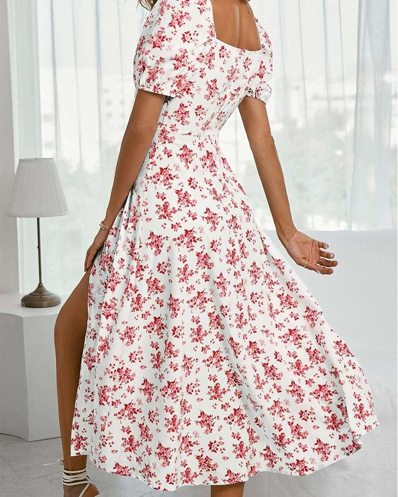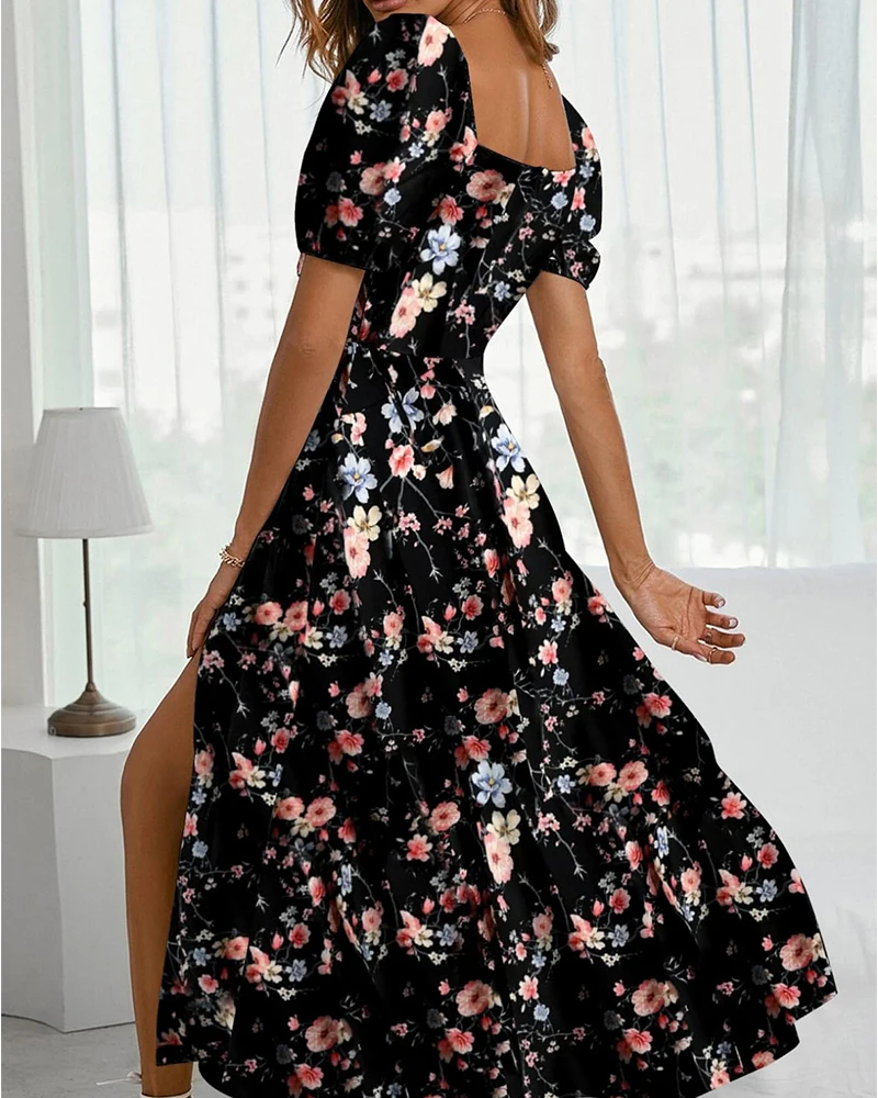 Hot Selling Fully Sublimated Printed Floral Short Sleeves Maxi Dress Square Neck Side Slit with Sweet Style