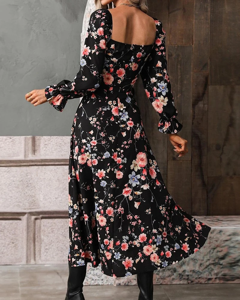 Temperament Big Swing Sun Dresses for Women Holiday Beachside Square Neck Long Puff Sleeve High Side Slit Tunic Boho Dresses