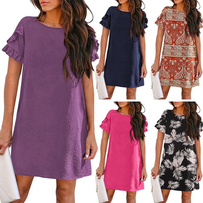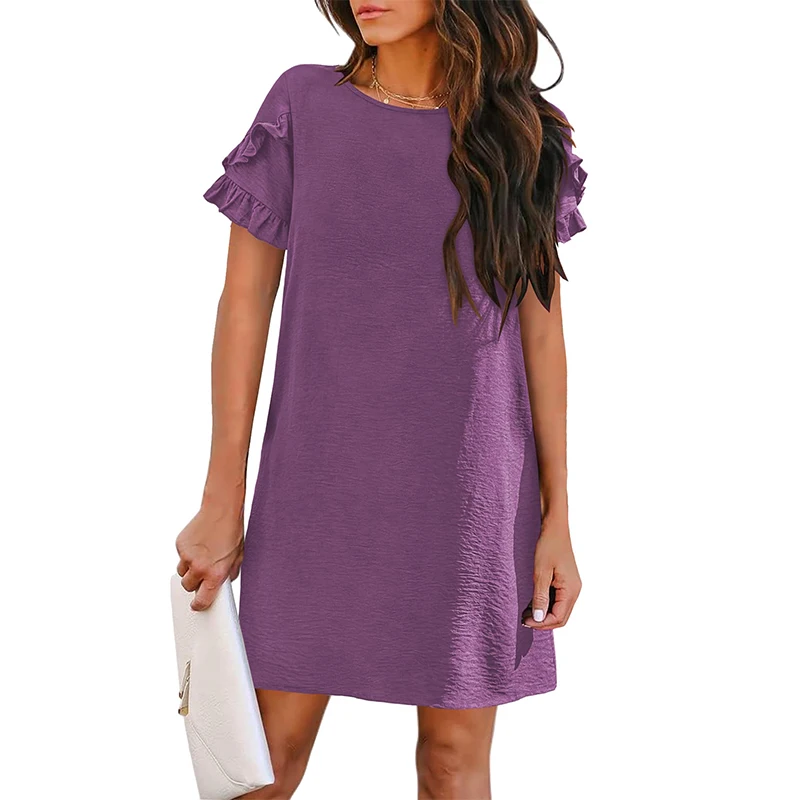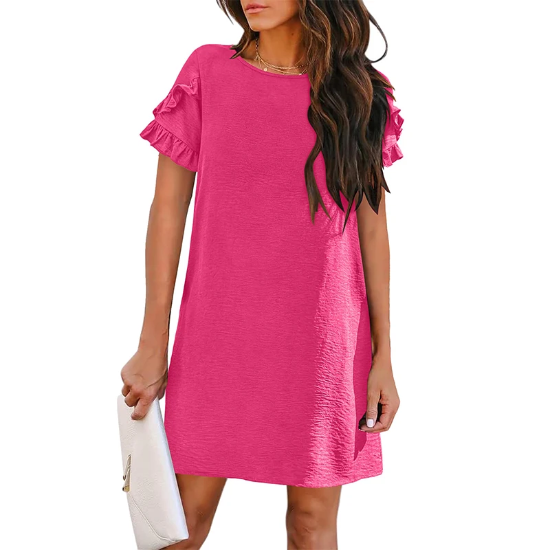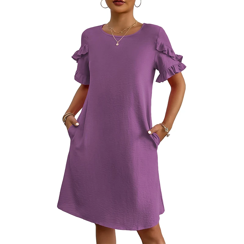 Women's Summer Round Neck Dress Short Sleeved A-Line Mini Beach Sundress Casual Straight Tube with Pocket Mini Skirt