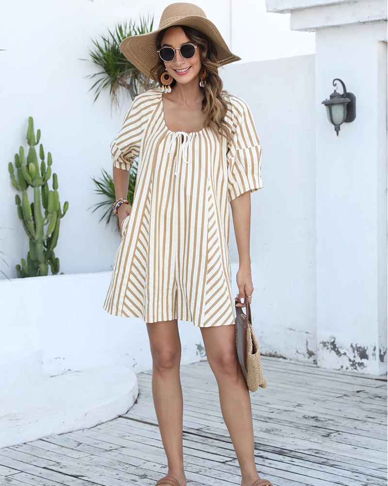 Women's Loose Striped Mini Dress V-Neck Puff Sleeve Drawstring Casual Summer Beach Vacation Party Boho Chic Fashion Dresses